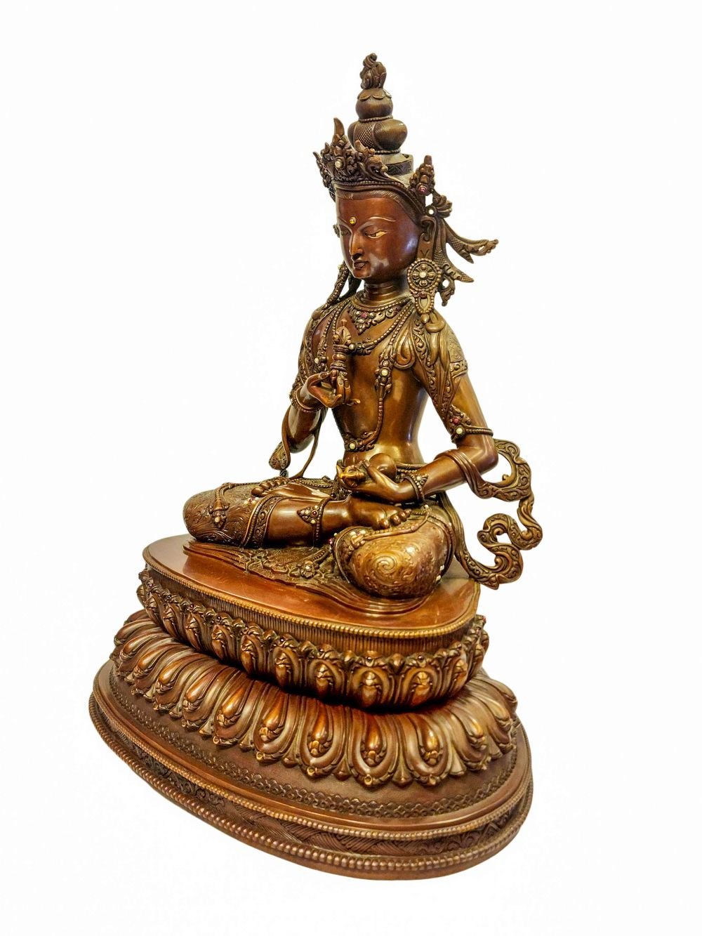 This Vajrasattva has been meticulously treated with a chocolate color antique patina. The intention behind this patina is to replicate the appearance of a copper statue that has gracefully aged over a century. Unlike a simple coat of paint, this patina is not applied superficially and is designed to endure. It undergoes an artificial oxidation process that adds depth and character, while also serving as a protective layer against natural oxidation.
