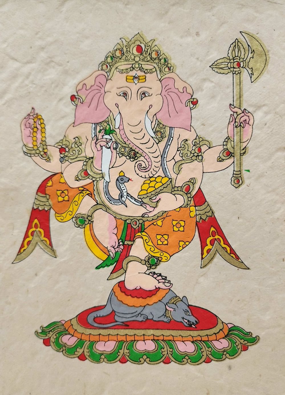 Ganesh, Buddhist Scroll, Made In Lokta Paper, Screen Printed, and Hand-painted , Remover of Obstacles, God of Wisdom and New Beginnings