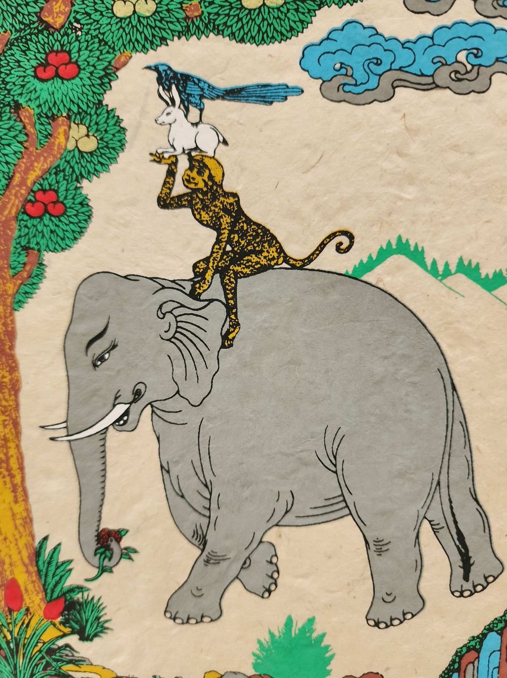 Elephant (or sometimes an elephant king): The elephant represents strength and power. In the context of the story, it symbolizes the strength of virtue and righteousness. The elephant is often depicted at the bottom of the stack in illustrations of the Four Friends, as it forms the stable base.