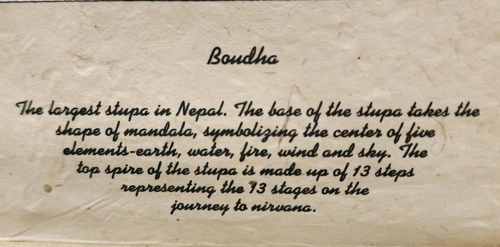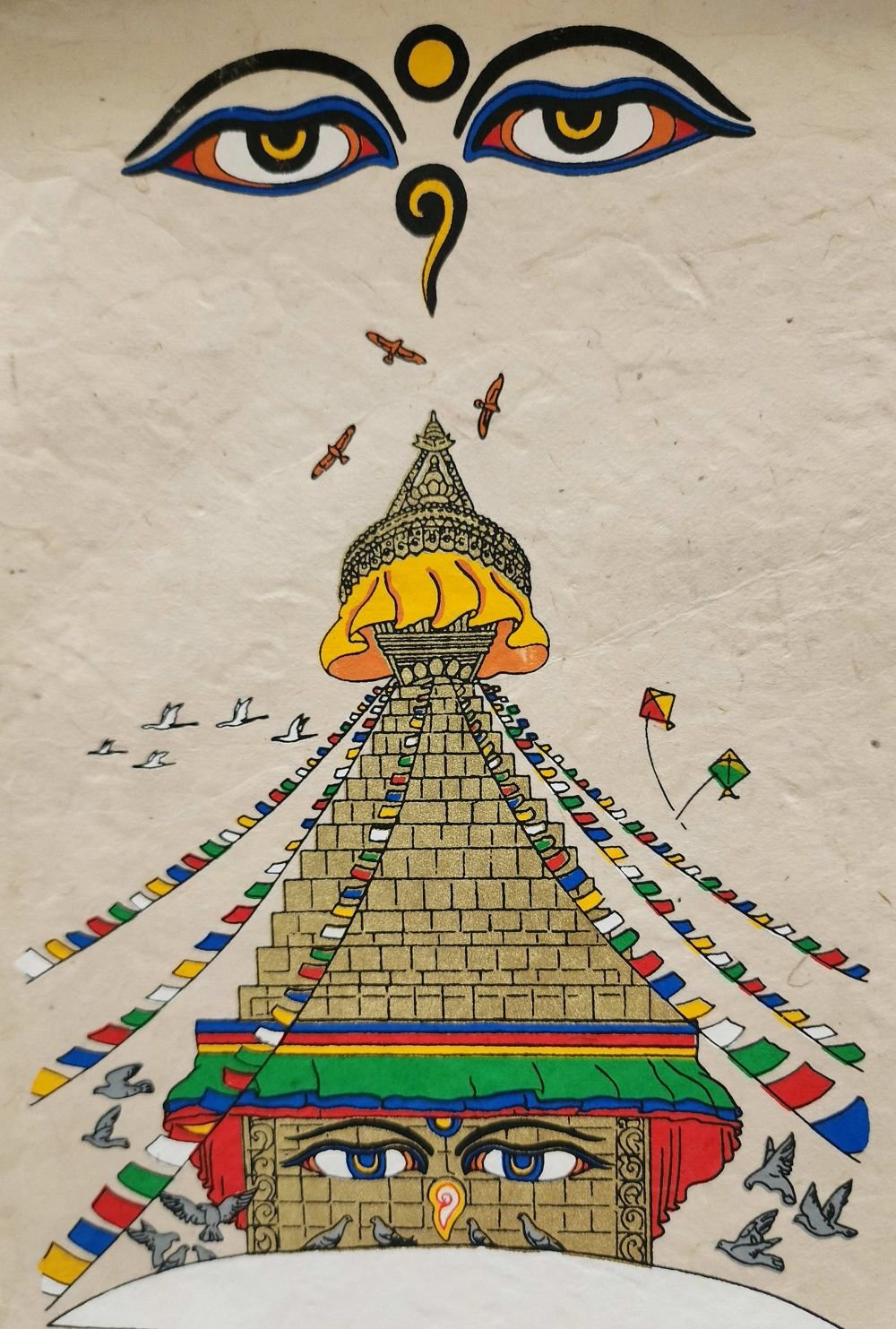 Boudhanath Stupa, Buddhist Scroll, Made In Lokta Paper, Screen Printed, and Hand-painted , Boudhanath Stupa, also known as the Stupa of Great Wisdom, is one of the largest and most revered Buddhist stupas in Nepal, symbolizing the enlightenment of the Buddha and serving as a major pilgrimag |