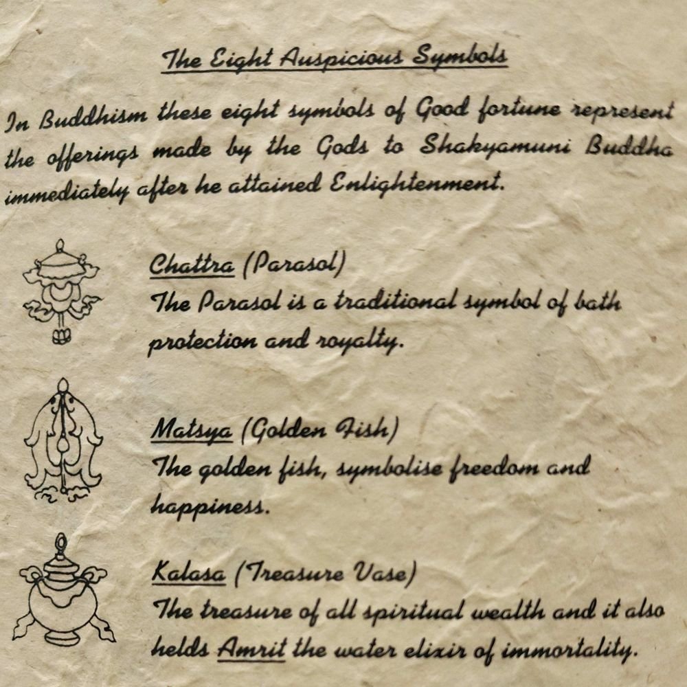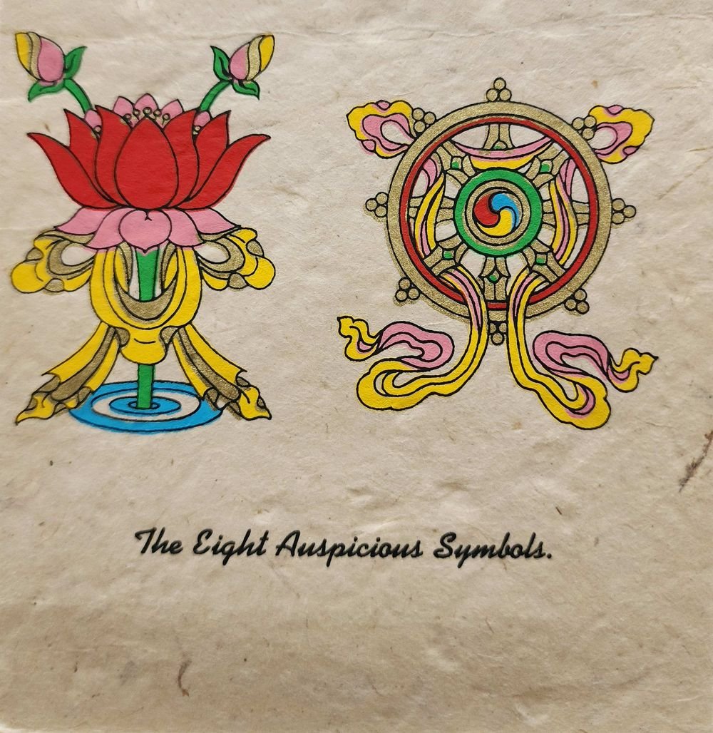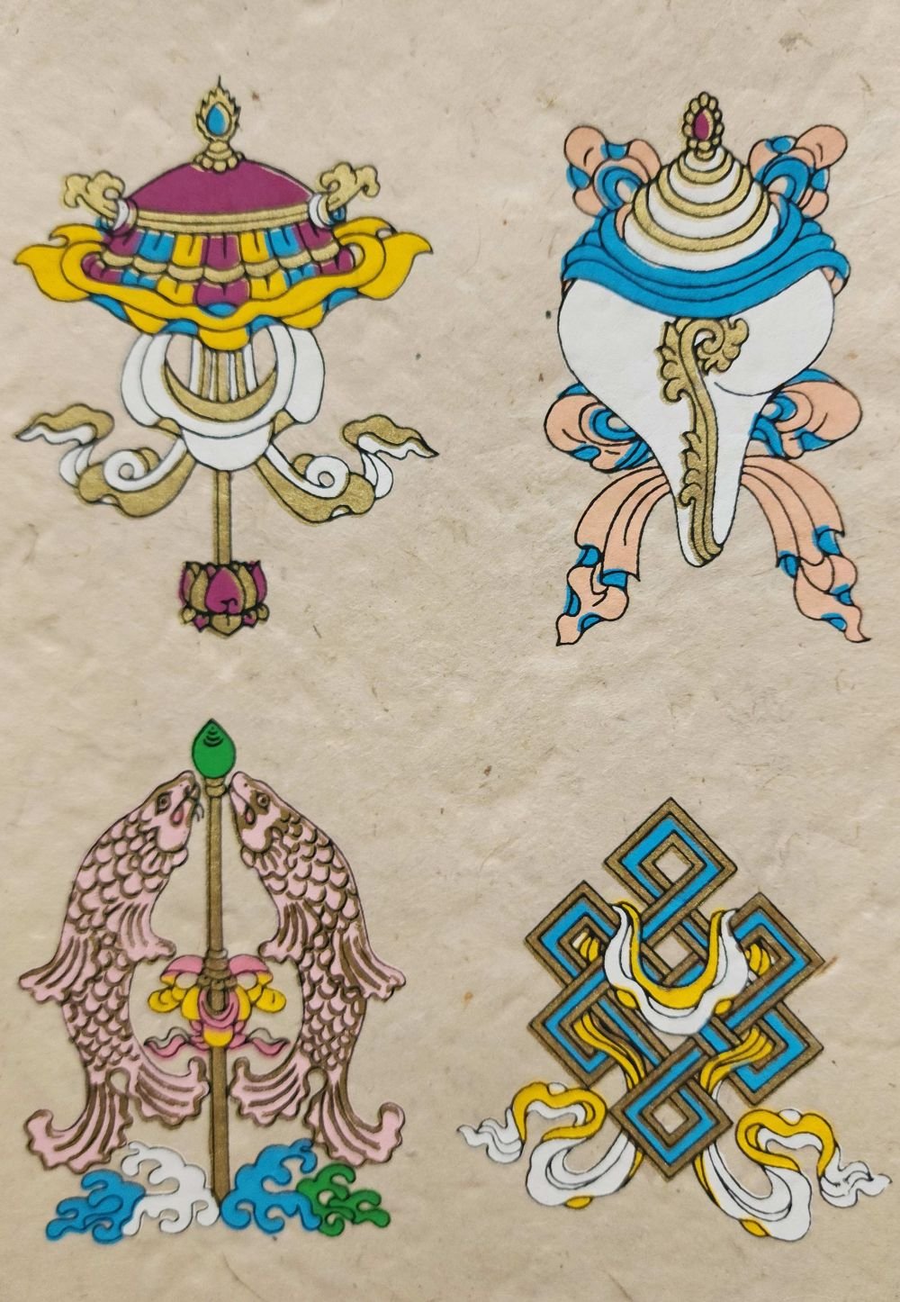 Eight Auspicious Symbols, Buddhist Scroll, Made In Lokta Paper, Screen Printed, and Hand-painted , representing prosperity and divine protection
