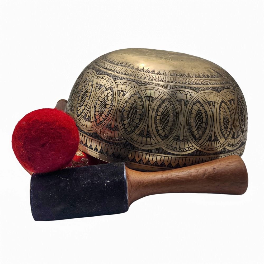 Jambati Singing Bowl, Buddhist Hand Beaten Carved, with Design, Select Accessories |