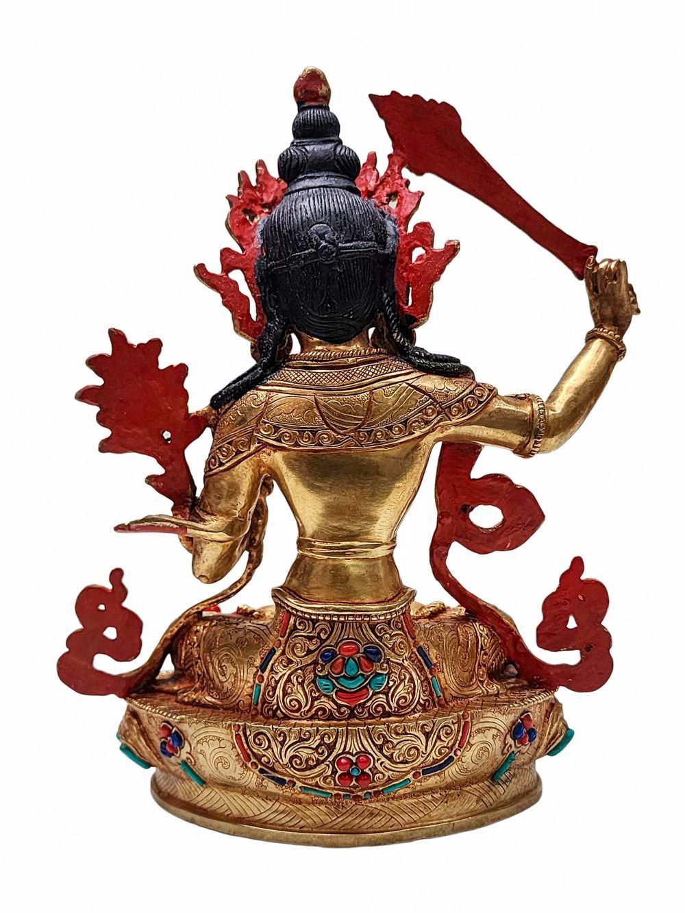 Manjushri, Buddhist Handmade Statue, Gold Plated, Face Painted and Stone Setting , Wisdom Buddha, cutting through ignorance with the sword of insight