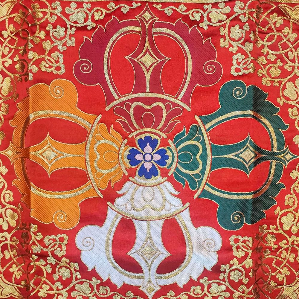 : About Double DorjeThe double vajra or crossed vajra is formed from four lotus-mounted vajra heads that emanate from a central hub towards the four cardinal directions and symbolizes the principle of absolute stability. In the cosmographic description of Mount Meru a vast crossed vajra supports and underlies the entire physical universe. Similarly in the representation of the mandala, a vast crossed vajra serves as the immoveable support or foundation of the mandala palace and here the central hub of the vajra is considered to be dark blue in color with the four heads colored to represent the four directions-white (East), yellow (South), red (West) and green (North). These also correspond to the five elements and the buddhas of the five families with blue Akshobhya in the center. Read More