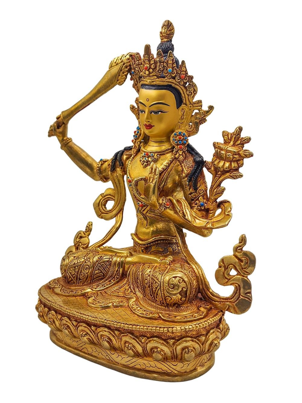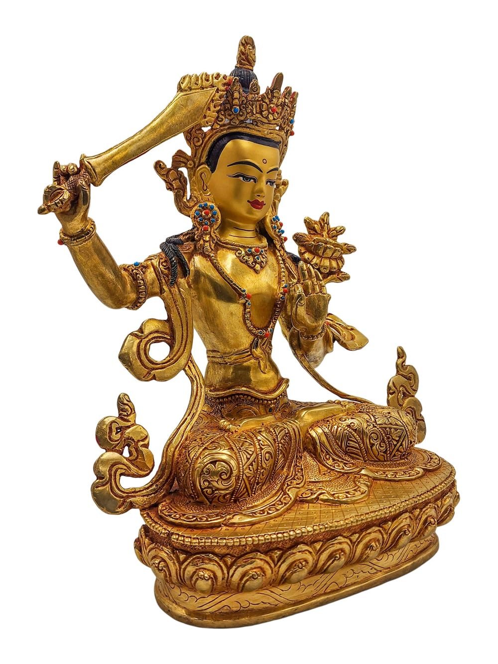 Manjushri, Buddhist Handmade Statue, Gold Plated and Face Painted , Wisdom Buddha, cutting through ignorance with the sword of insight