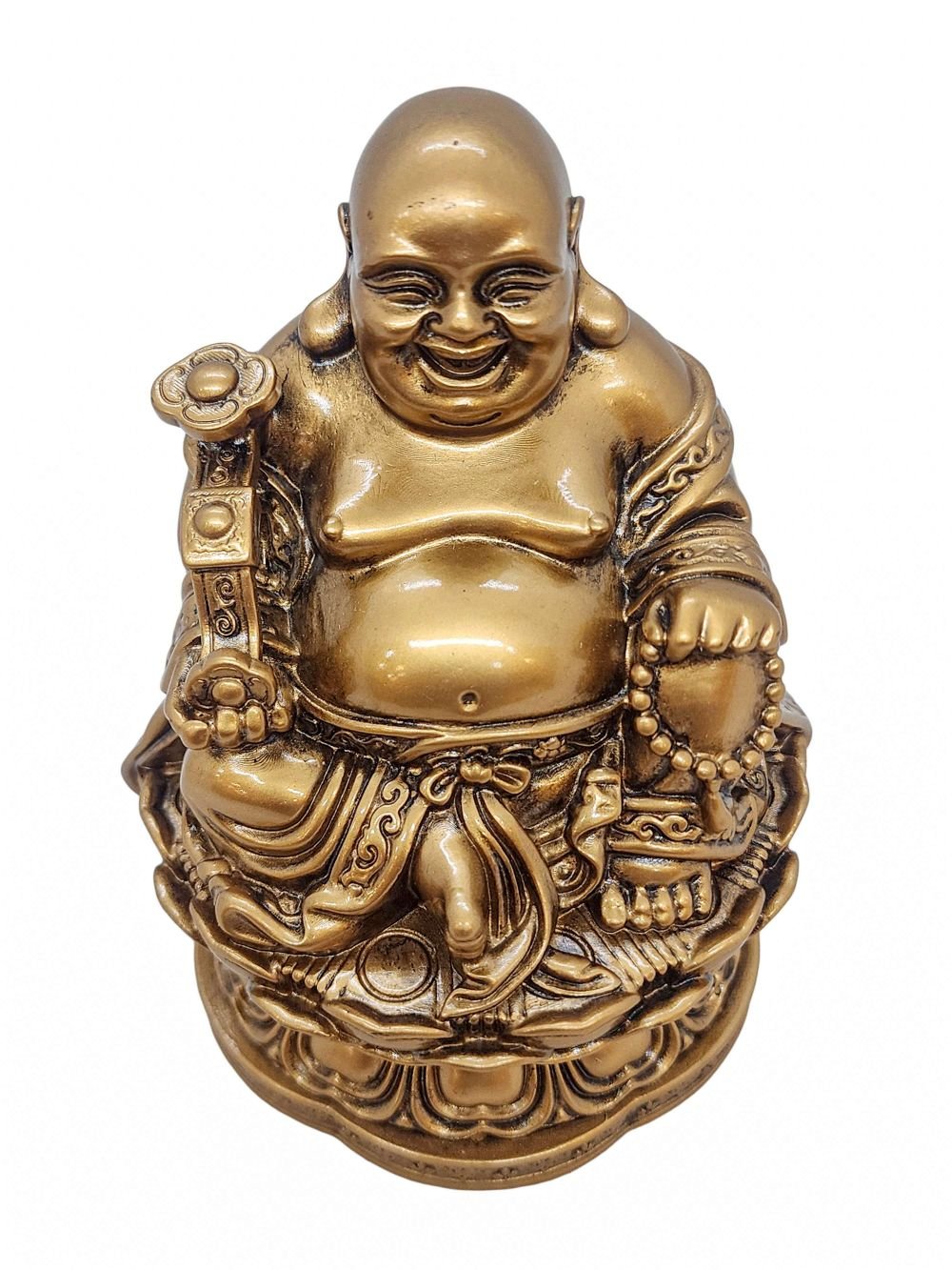 The laughing Buddha has been crafted using the Ceramic mold casting process, a modern approach that provides an alternative to traditional methods such as the lost-wax system or rubber molding. Also referred to as ceramic molding, this technique involves the creation of a ceramic mold to cast the statue. The process begins by making a precise and detailed wax model of the desired sculpture. The wax model is then coated with layers of ceramic material, creating a sturdy mold. Once the mold is complete, it is fired in a kiln, causing the wax to melt and escape, leaving behind a cavity that perfectly replicates the original sculpture. Molten metal is then poured into the mold, allowing it to fill the cavity and take on the desired form. Once cooled and solidified, the ceramic mold is carefully broken away, revealing the final metal statue. Read More