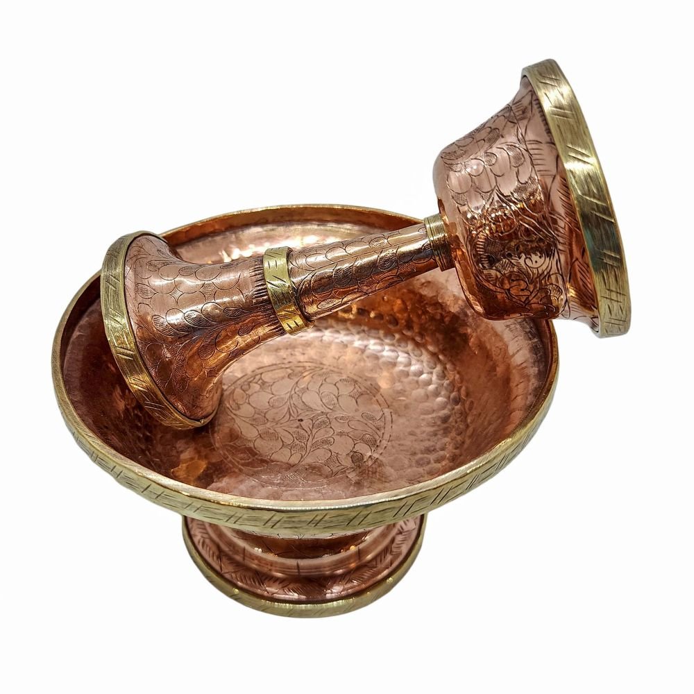The Serkyem offering is offered by pouring the beverage into a cup-like a wine glass, which is placed into a lower bowl.