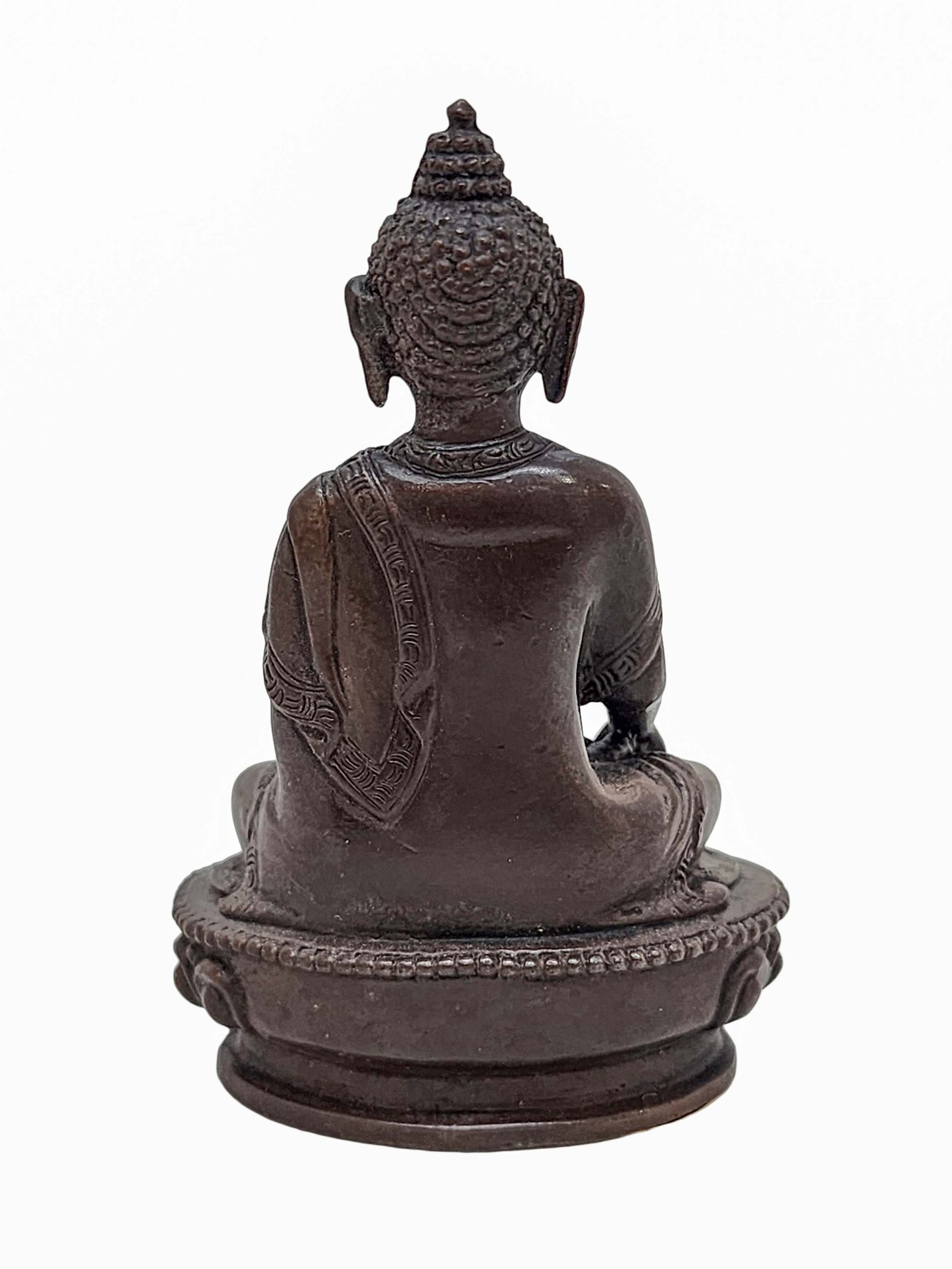 This Shakyamuni Buddha has been meticulously treated with a chocolate color antique patina. The intention behind this patina is to replicate the appearance of a copper statue that has gracefully aged over a century. Unlike a simple coat of paint, this patina is not applied superficially and is designed to endure. It undergoes an artificial oxidation process that adds depth and character, while also serving as a protective layer against natural oxidation.