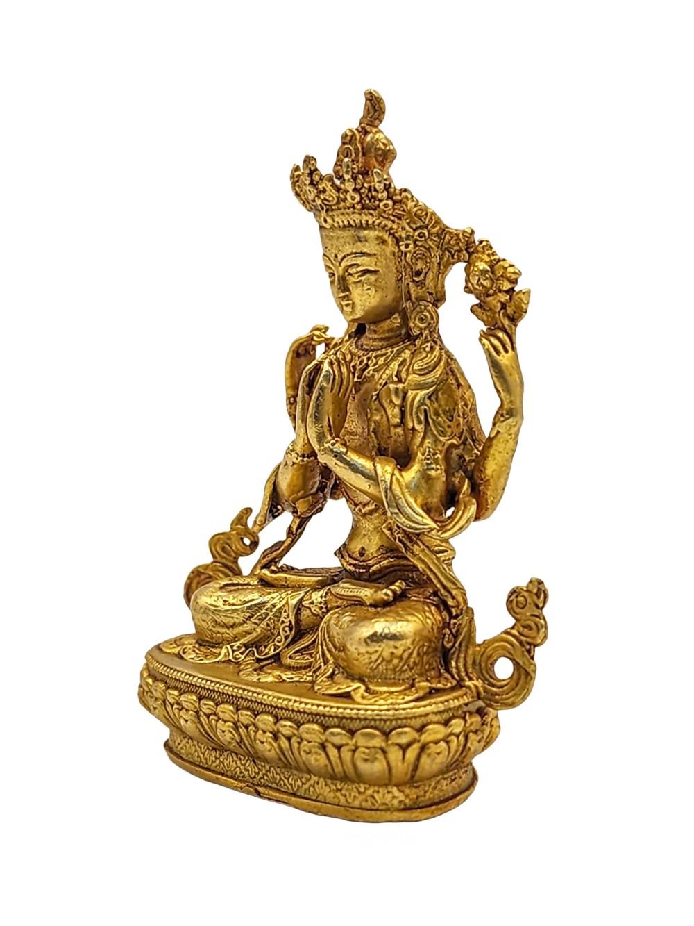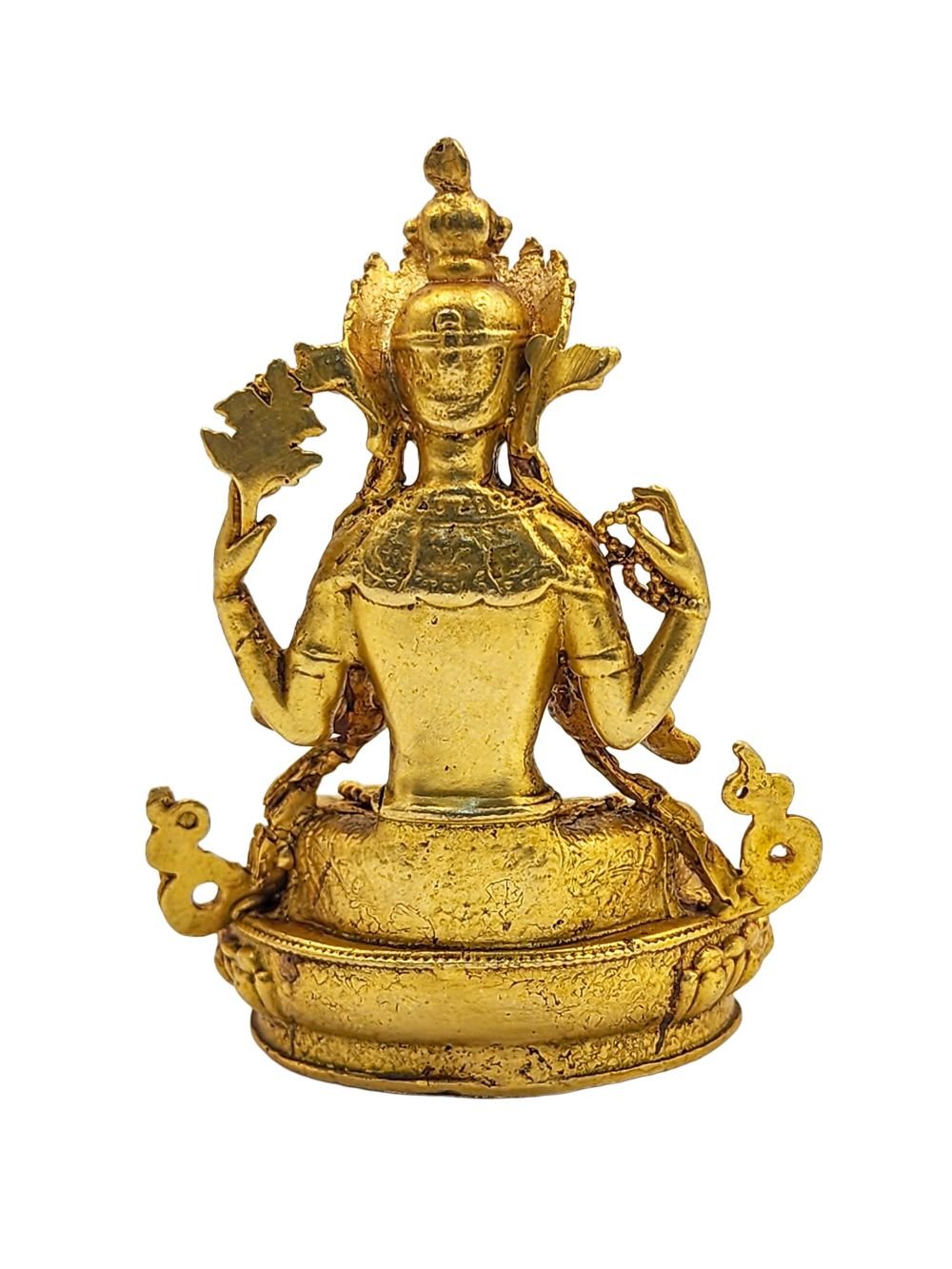 This Chenrezig is finished with full gold plating. also known as mercury gold plating or fire gold plating. This traditional technique involves the application of a genuine layer of gold onto the Chenrezig. Referred to as mercury gold plating, it is considered the correct and authentic form of gold plating in Nepal. Despite being more expensive than electroplating, this traditional mercury gold plating is gaining popularity again in Nepal. People are drawn to its authenticity, longevity, and the unmatched beauty it brings to the Chenrezig. The resurgence of interest in this traditional form of gold plating reflects a growing appreciation for the craftsmanship and cultural heritage of Nepal Read More