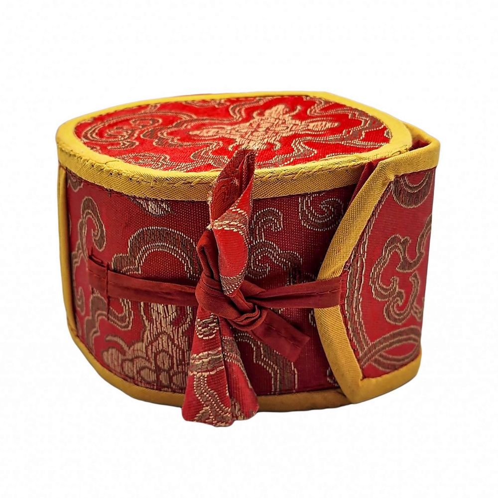 This Damaru comes with a splendid Cochin brocade cover. This meticulously designed cover safeguards the damaru, ensuring its protection against external elements, and offers unparalleled convenience for transporting this sacred musical instrument. The exquisite Cochin brocade fabric lends an air of elegance to the ensemble, while the brocade tail delicately adorns the damaru, elevating its aesthetic appeal to new heights. Experience the harmonious fusion of functionality and beauty with this exceptional combination, perfect for any discerning music enthusiast or spiritual practitioner.