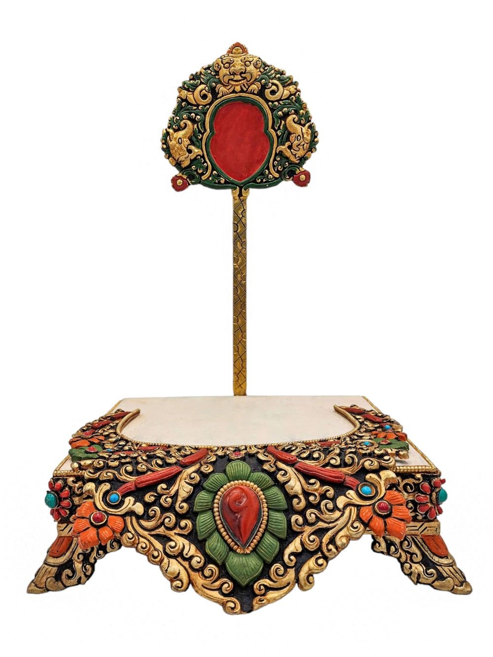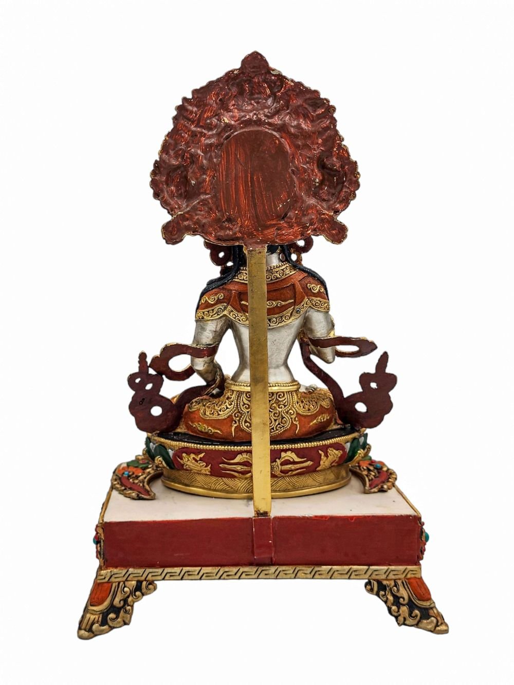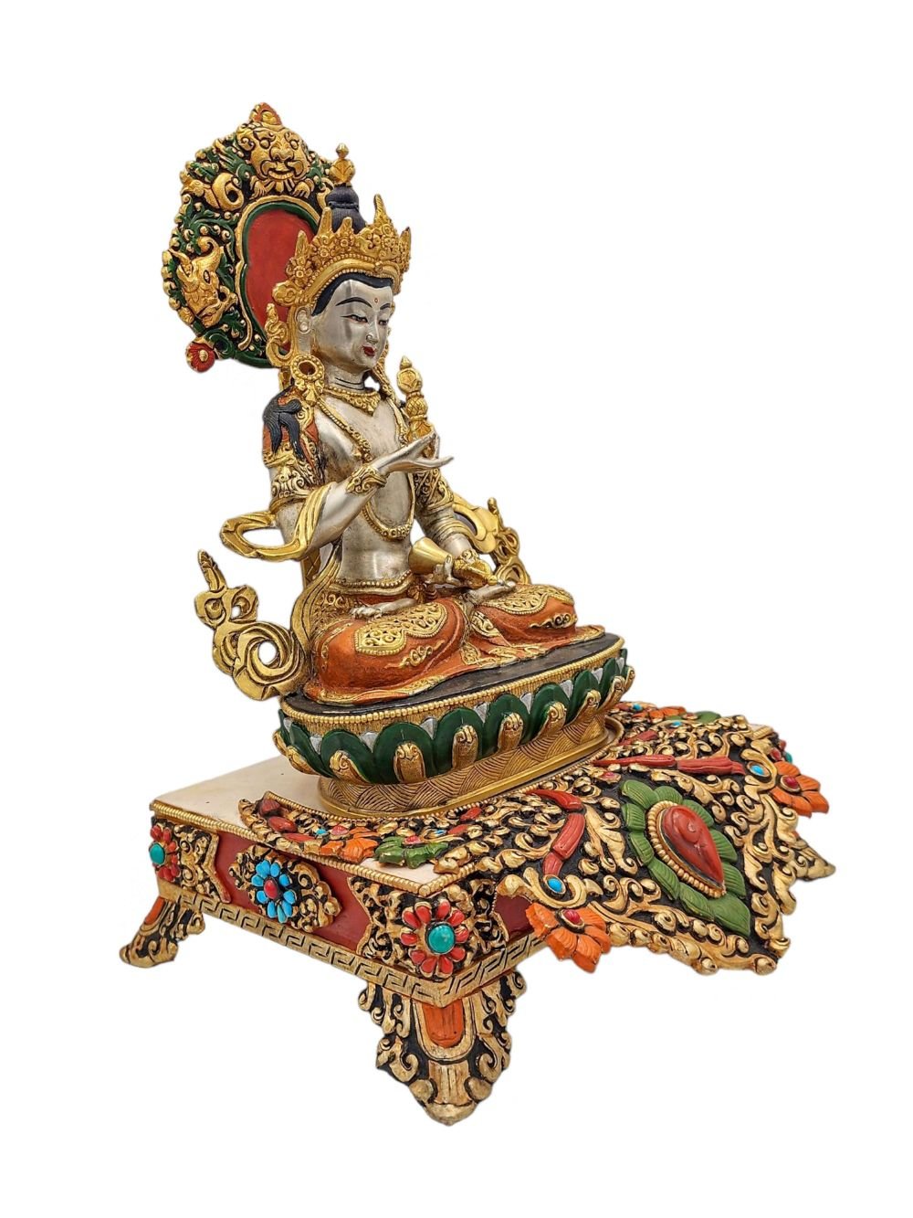 The Vajrasattva is adorned with an exquisite array of semi-precious stones, including turquoise, coral, and lapis lazuli. These stones are carefully selected and meticulously placed on the Vajrasattva's surface, adding a touch of opulence and enhancing its overall beauty. Each stone is thoughtfully positioned using a high-quality adhesive, ensuring secure and long-lasting attachment. The vibrant colors and unique patterns of the stones create a captivating contrast against the backdrop of the Vajrasattva, elevating its visual appeal and making it truly eye-catching. Read More