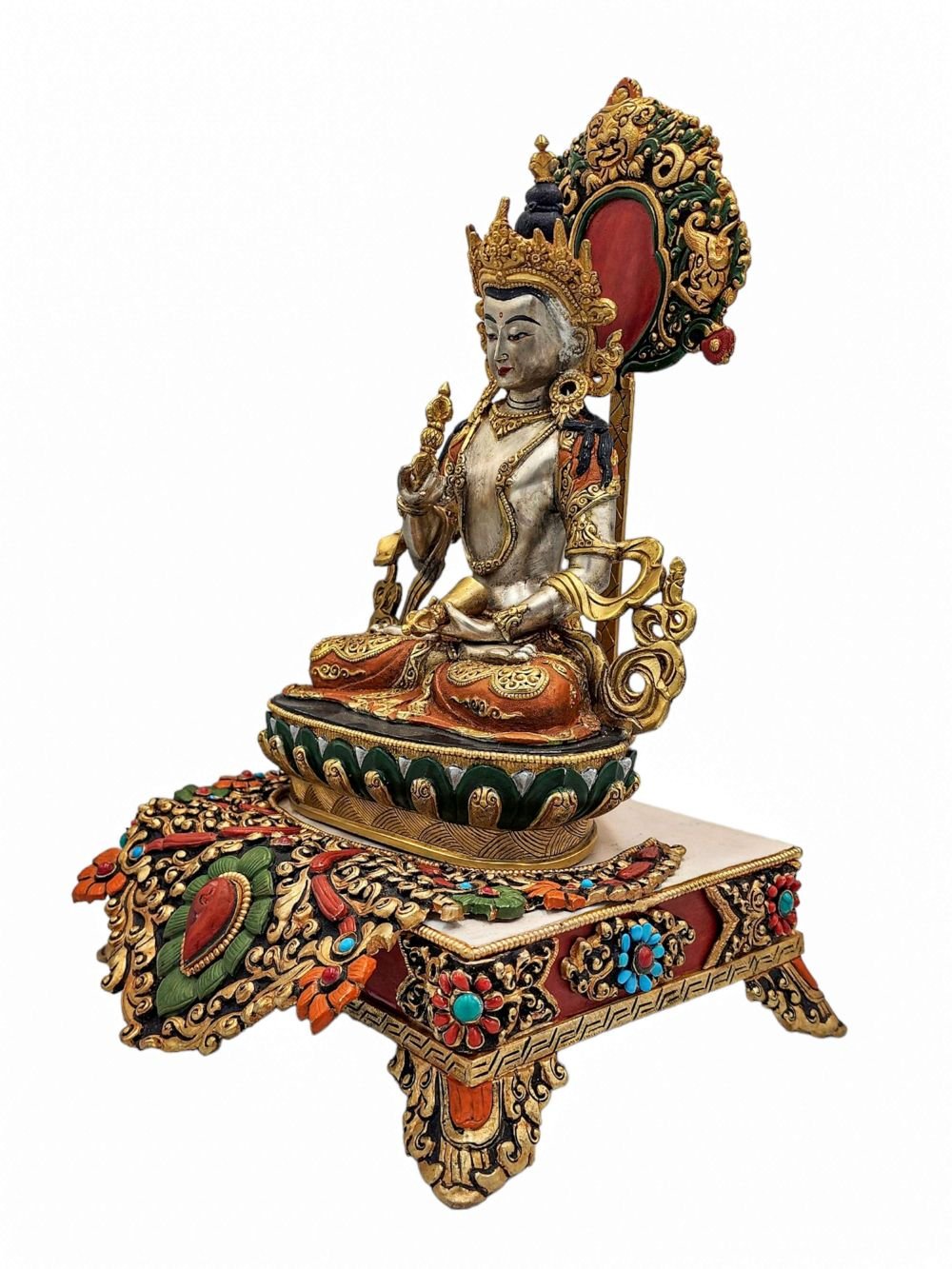 Vajrasattva, Buddhist Handmade Statue with Stand, Partly Gold Plated, Traditional Color Finishing and Stone Setting , Purifier of karma, embodying purity and enlightenment