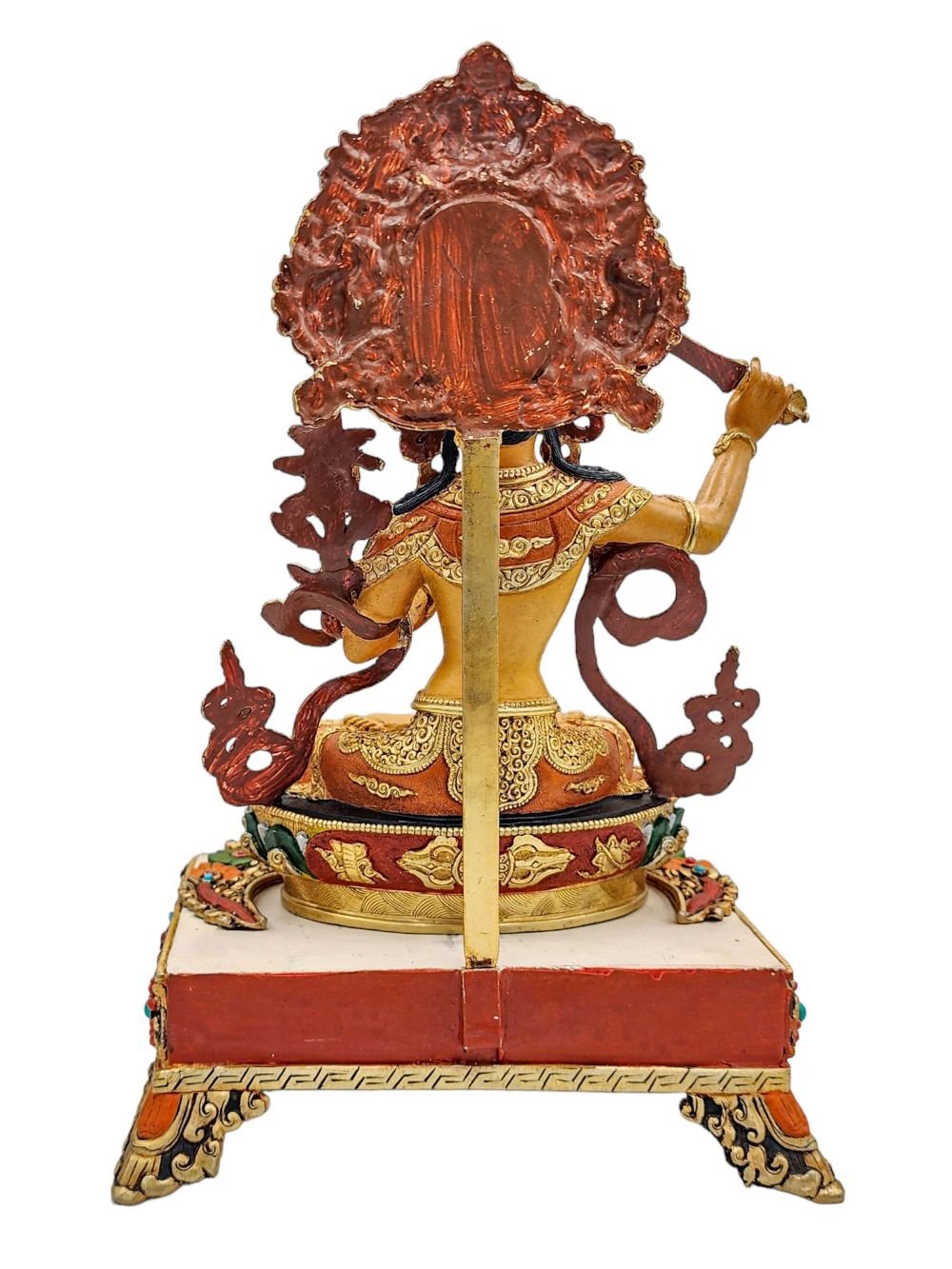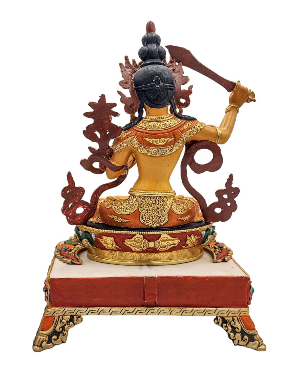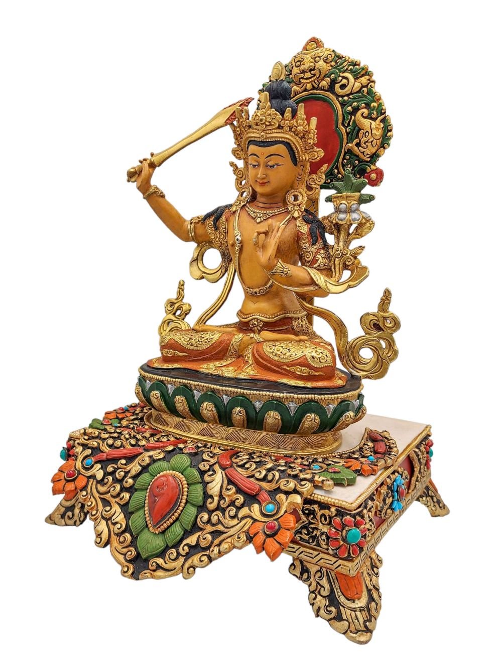 Manjushri, Buddhist Handmade Statue with Stand, Partly Gold Plated, Traditional Color Finishing and Stone Setting , Wisdom Buddha, cutting through ignorance with the sword of insight