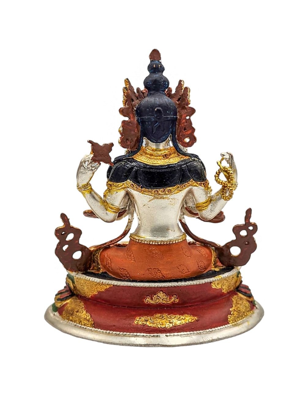 This Chenrezig has a Partly gold-plated finish. Partly fire gold gilding, a common practice in Nepali handicrafts. This technique is skillfully employed by artisans to create intricate designs on various metal objects, including statues, jewelry, and decorative items. Through a process, a mask or resist is applied to safeguard specific areas from the gold plating. The object is then subjected to high temperatures, allowing the gold to beautifully adhere to exposed surfaces using a combination of heat and pressure.