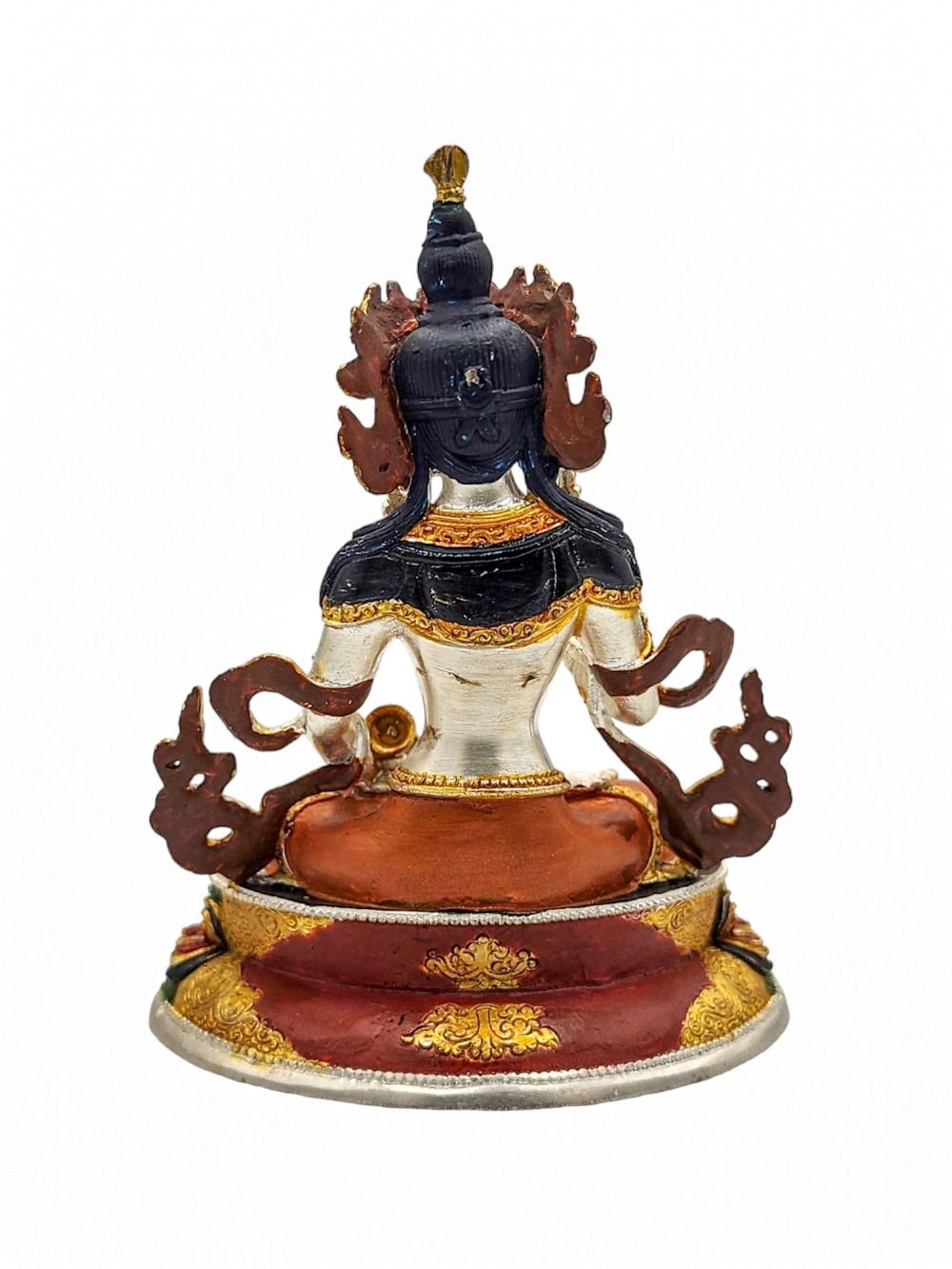 This Vajrasattva has a Partly gold-plated finish. Partly fire gold gilding, a common practice in Nepali handicrafts. This technique is skillfully employed by artisans to create intricate designs on various metal objects, including statues, jewelry, and decorative items. Through a process, a mask or resist is applied to safeguard specific areas from the gold plating. The object is then subjected to high temperatures, allowing the gold to beautifully adhere to exposed surfaces using a combination of heat and pressure.