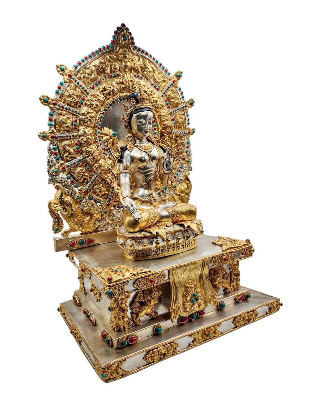 White Tara, Buddhist Handmade Statue On Throne, Gold and Silver. Plated, Stone Setting, High Quality , Goddess of longevity, healing, and serene compassion