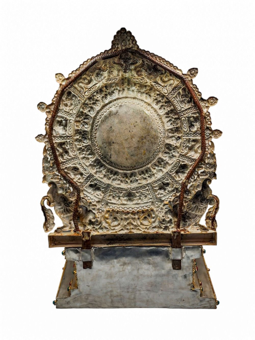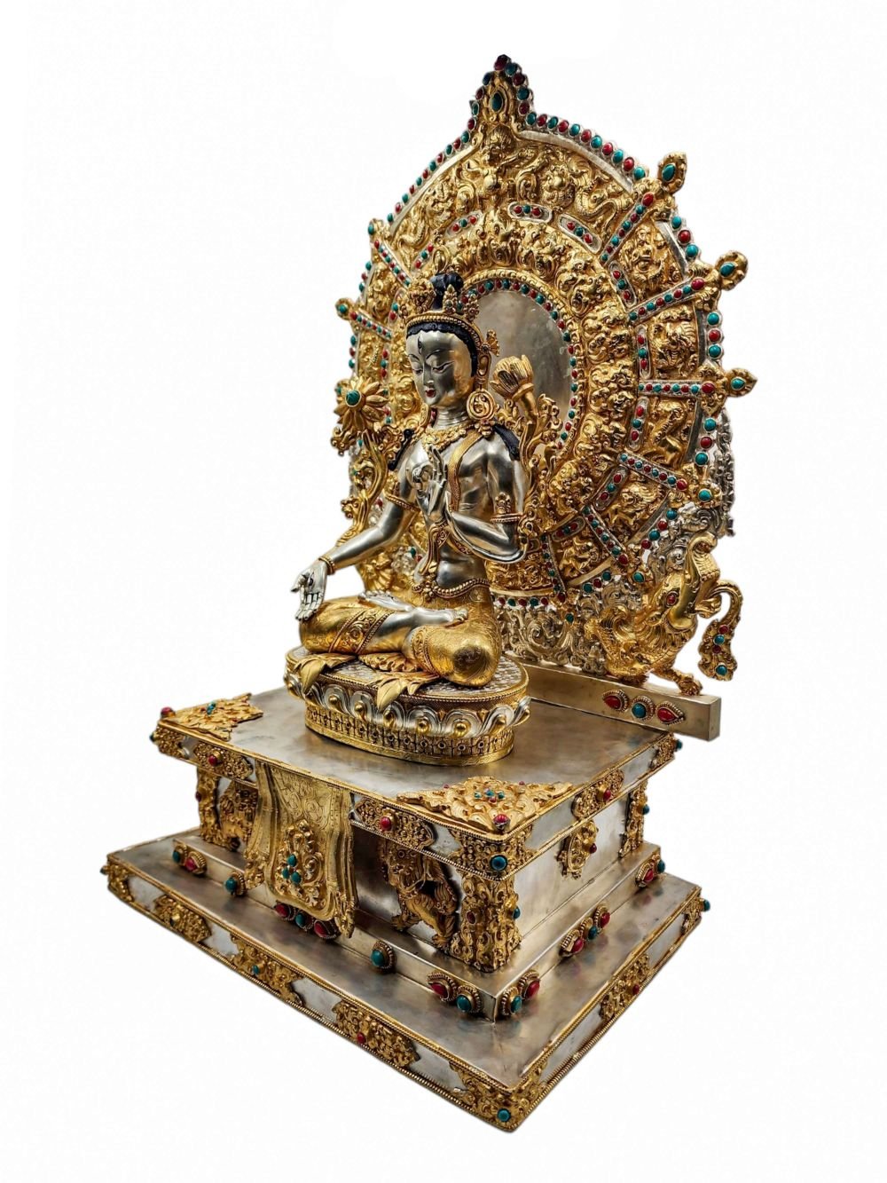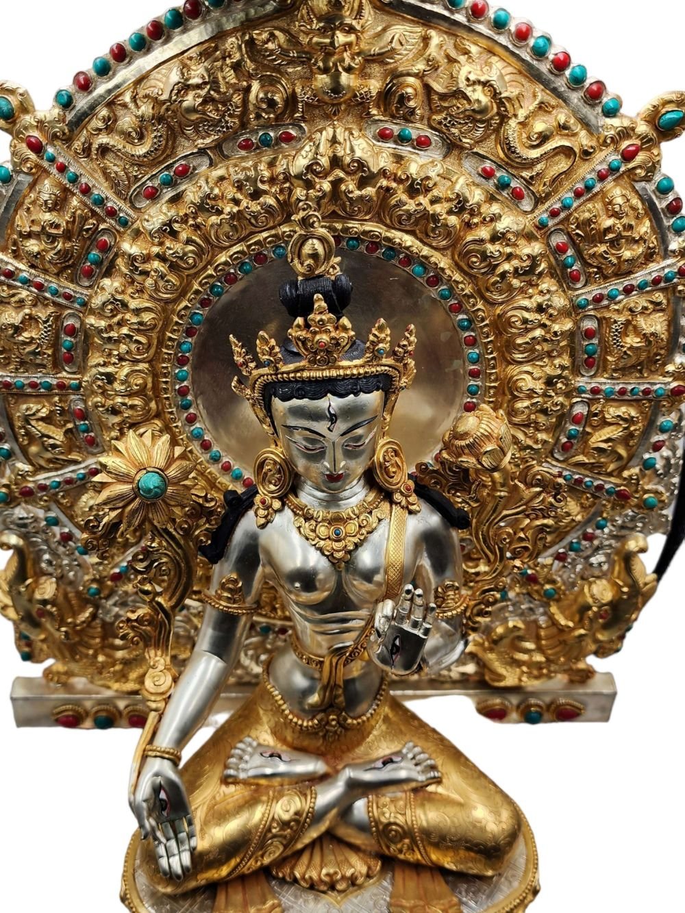 The White Tara has a full Silver plated finish, Sliver plating process involves the application of a thin layer of genuine silver onto the surface of the White Tara, creating a stunning and lustrous appearance. Skilled artisans handle the silver plating, ensuring even coverage and a flawless finish. The silver plating adds a touch of elegance and sophistication to the White Tara, enhancing its overall aesthetic appeal.