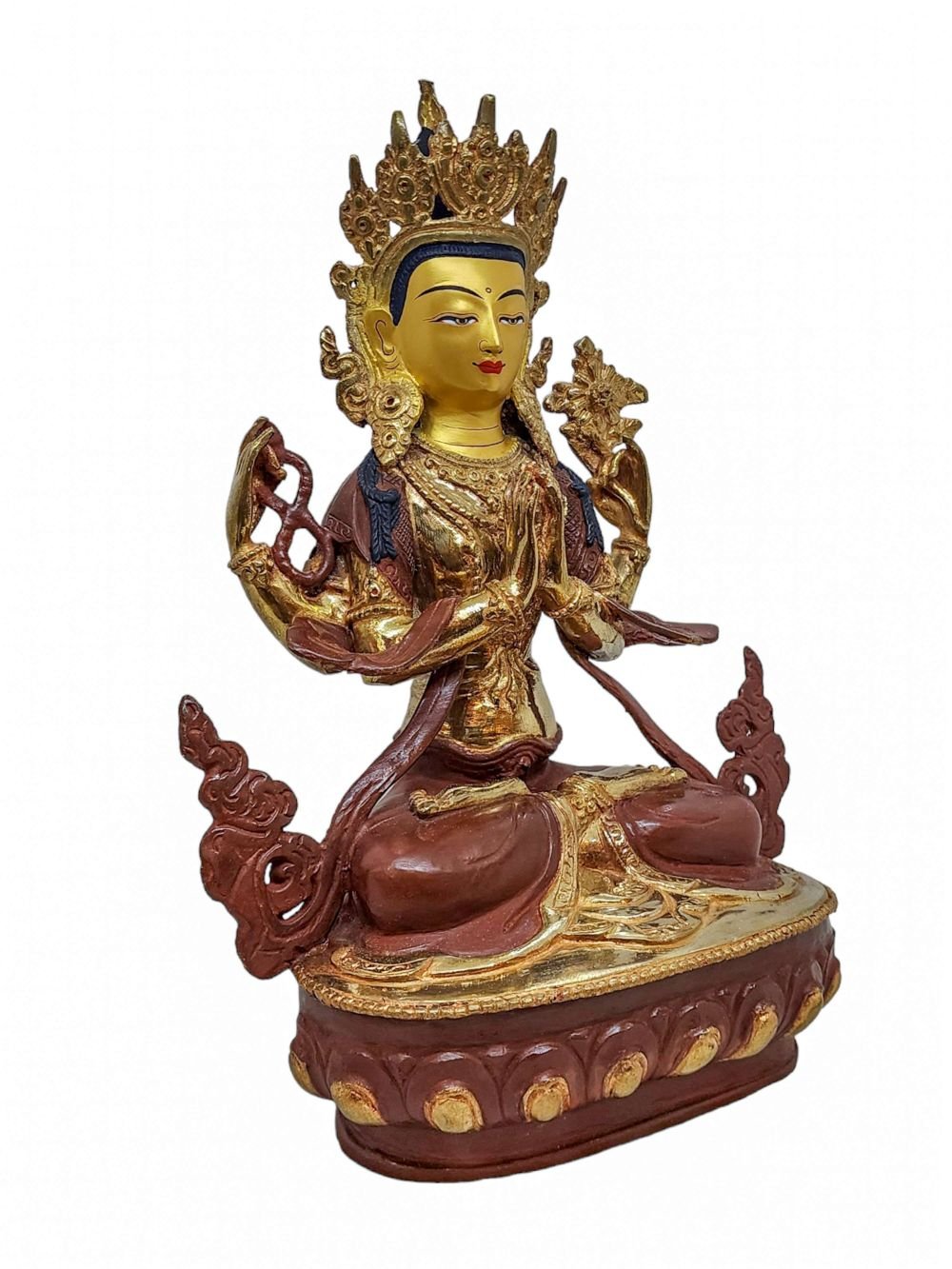 This Chenrezig has a Partly gold-plated finish. Partly fire gold gilding, a common practice in Nepali handicrafts. This technique is skillfully employed by artisans to create intricate designs on various metal objects, including statues, jewelry, and decorative items. Through a process, a mask or resist is applied to safeguard specific areas from the gold plating. The object is then subjected to high temperatures, allowing the gold to beautifully adhere to exposed surfaces using a combination of heat and pressure.