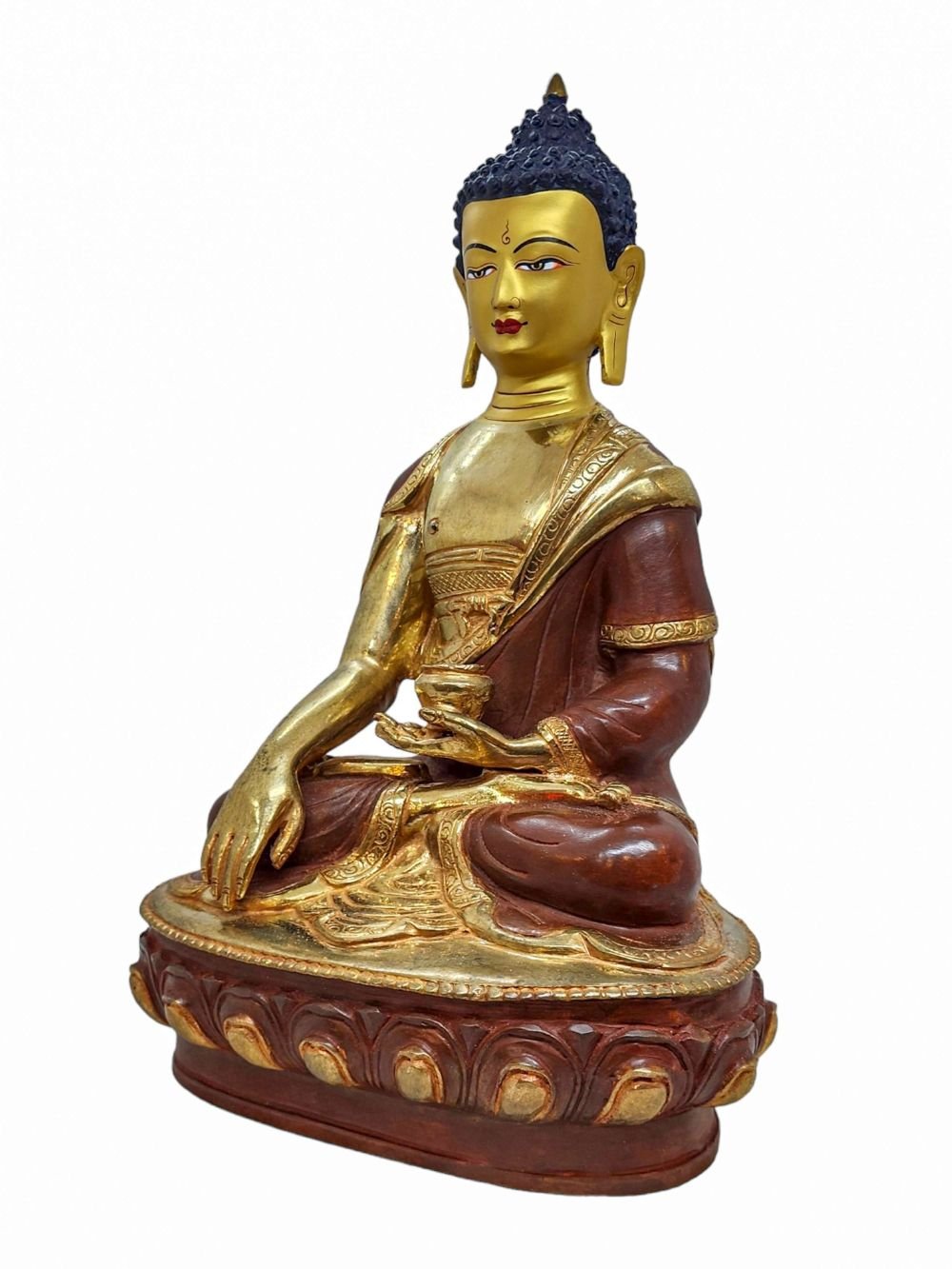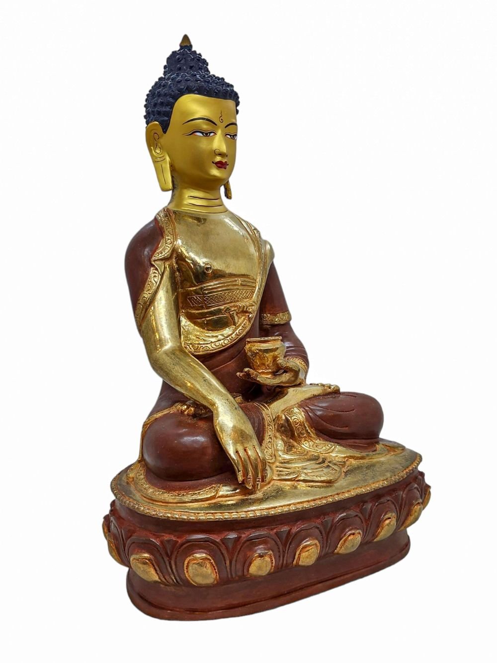The face of Shakyamuni Buddha is painted with gold to enhance its significant features, particularly the eyes, and lips. This detailed painting is essential as it brings forth the crucial attributes of the expression of eyes and lips that metal carving alone cannot capture.