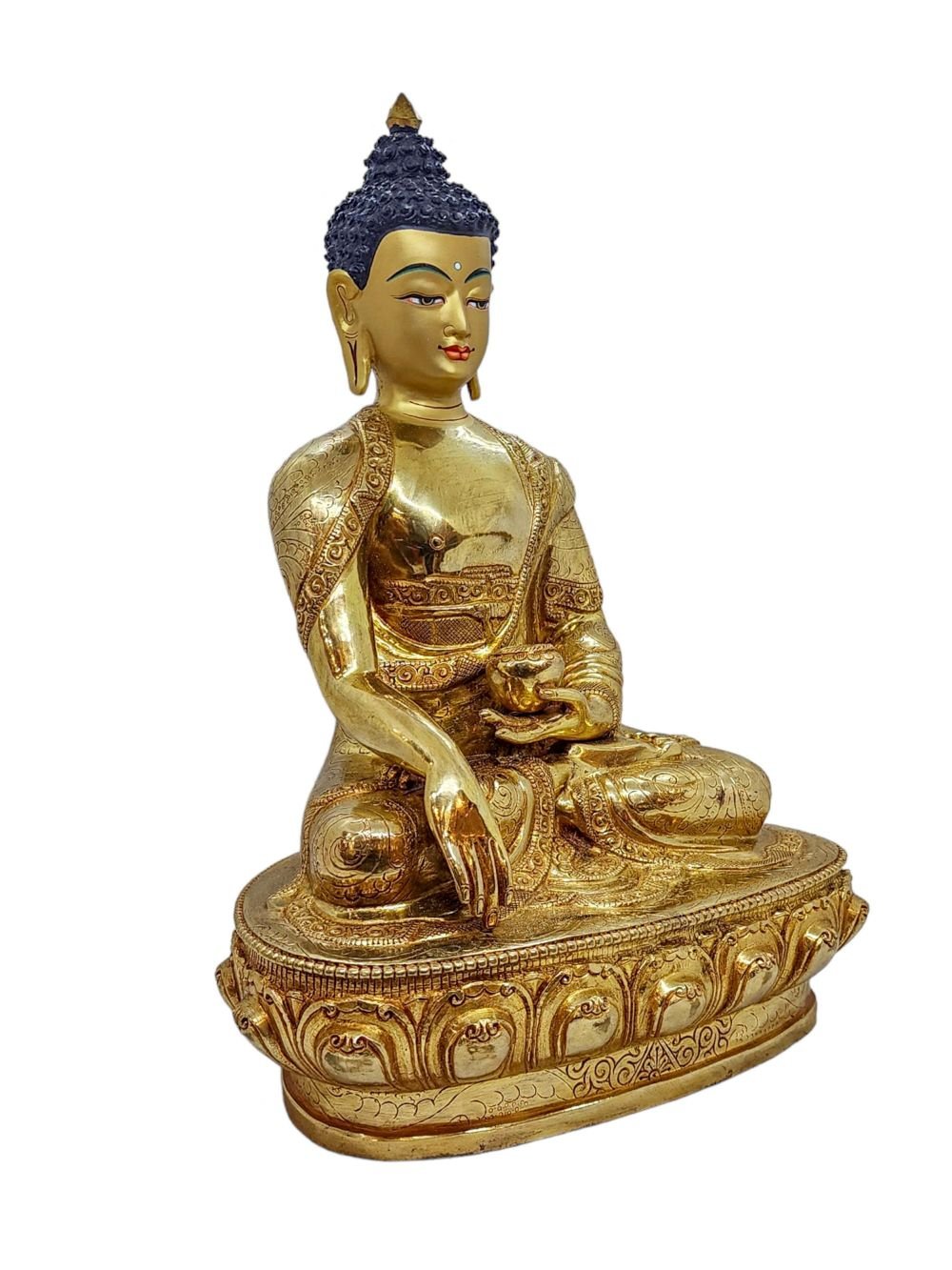 The face of Shakyamuni Buddha is painted with gold to enhance its significant features, particularly the eyes, and lips. This detailed painting is essential as it brings forth the crucial attributes of the expression of eyes and lips that metal carving alone cannot capture.