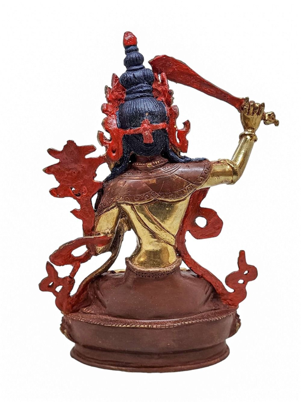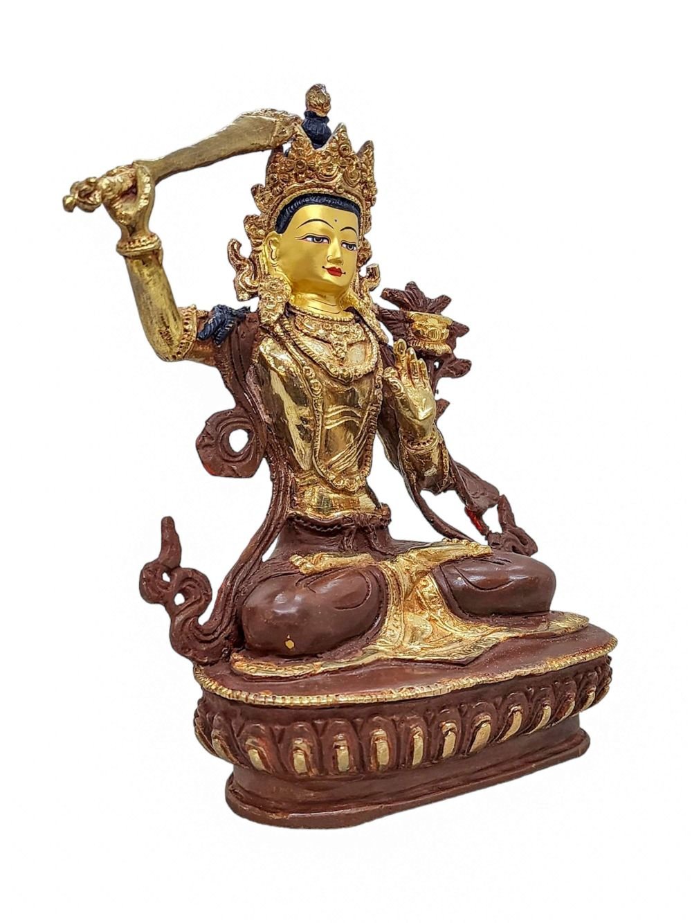 This Manjushri has a Partly gold-plated finish. Partly fire gold gilding, a common practice in Nepali handicrafts. This technique is skillfully employed by artisans to create intricate designs on various metal objects, including statues, jewelry, and decorative items. Through a process, a mask or resist is applied to safeguard specific areas from the gold plating. The object is then subjected to high temperatures, allowing the gold to beautifully adhere to exposed surfaces using a combination of heat and pressure.