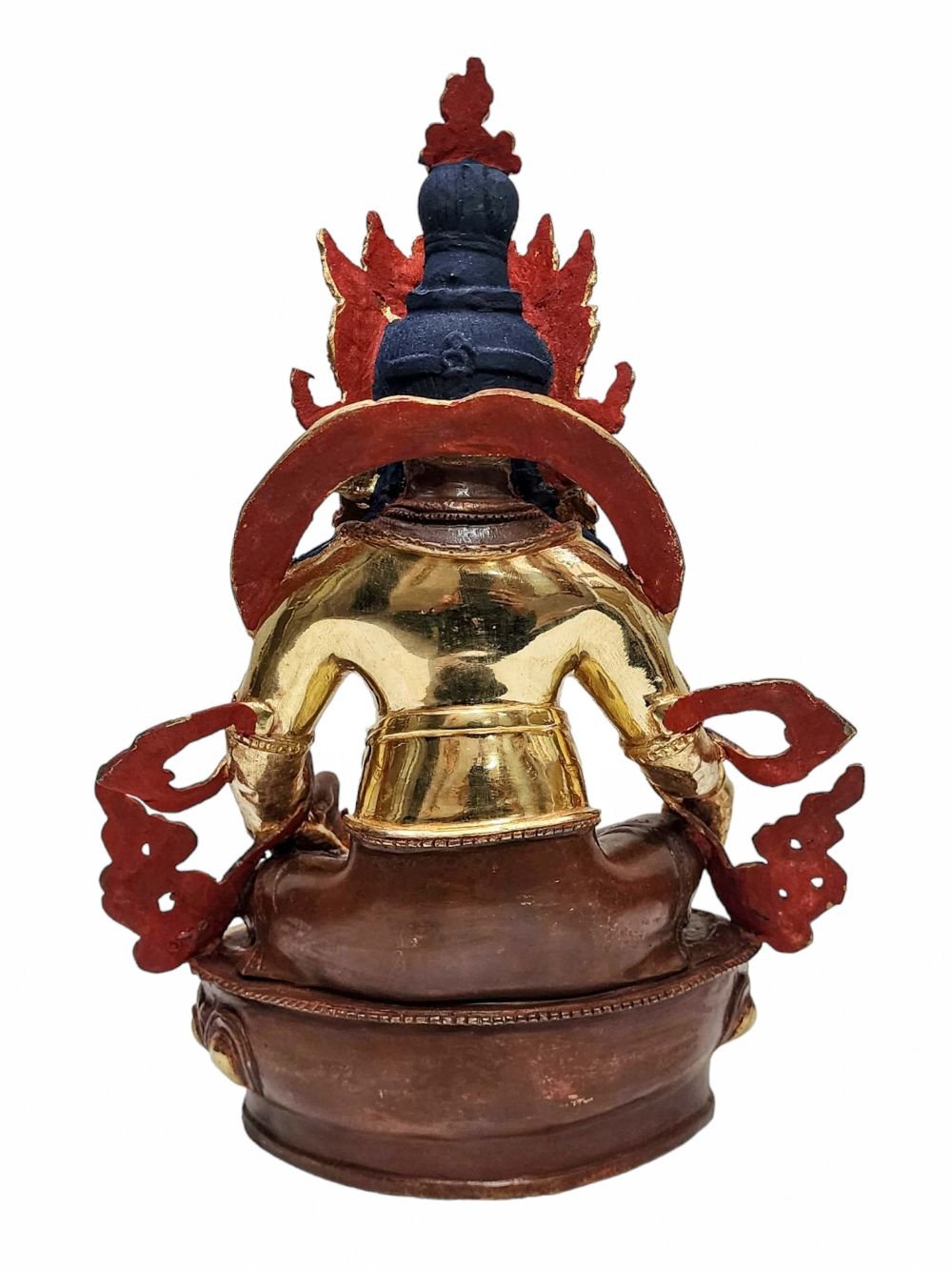 The face of Yellow Jambhala is painted with gold to enhance its significant features, particularly the eyes, and lips. This detailed painting is essential as it brings forth the crucial attributes of the expression of eyes and lips that metal carving alone cannot capture.