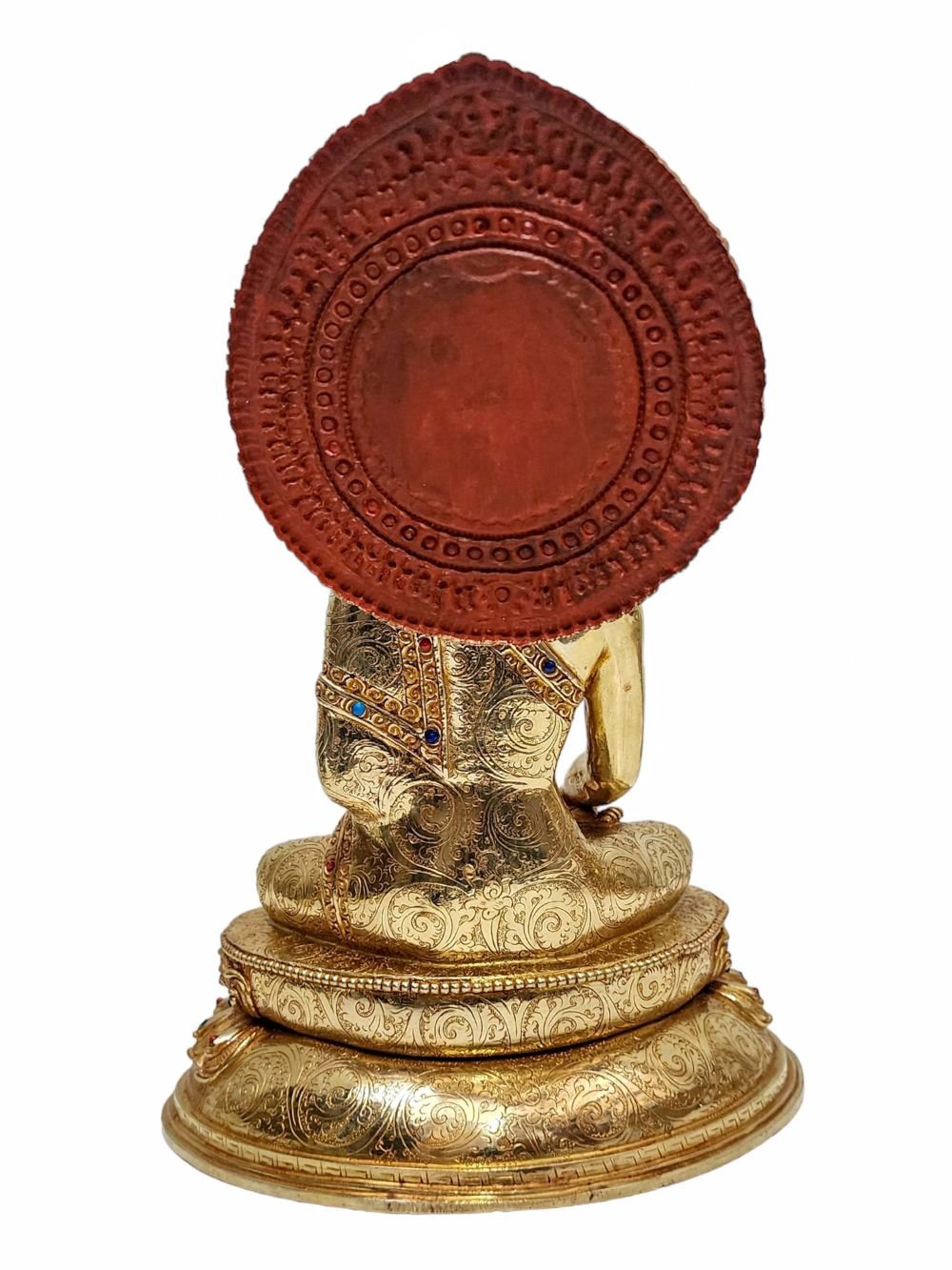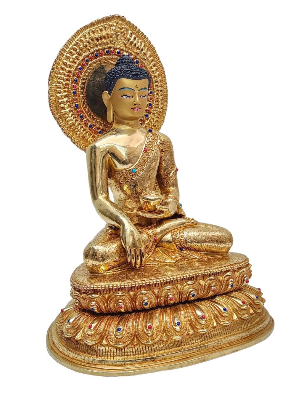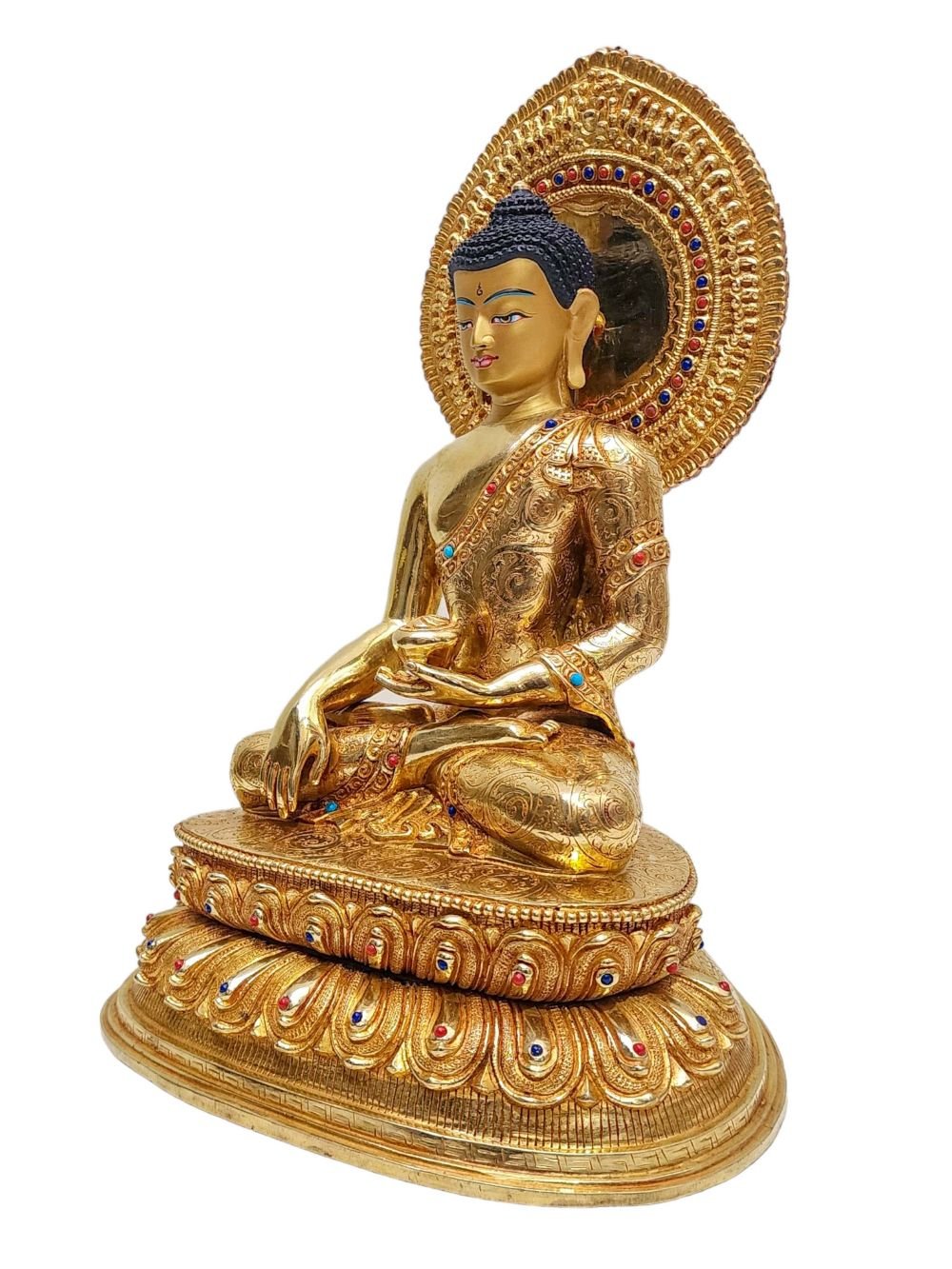 This Shakyamuni Buddha is finished with full gold plating. also known as mercury gold plating or fire gold plating. This traditional technique involves the application of a genuine layer of gold onto the Shakyamuni Buddha. Referred to as mercury gold plating, it is considered the correct and authentic form of gold plating in Nepal. Despite being more expensive than electroplating, this traditional mercury gold plating is gaining popularity again in Nepal. People are drawn to its authenticity, longevity, and the unmatched beauty it brings to the Shakyamuni Buddha. The resurgence of interest in this traditional form of gold plating reflects a growing appreciation for the craftsmanship and cultural heritage of Nepal Read More
