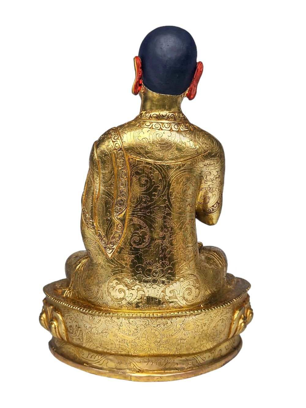 This Tsongkhapa is finished with full gold plating. also known as mercury gold plating or fire gold plating. This traditional technique involves the application of a genuine layer of gold onto the Tsongkhapa. Referred to as mercury gold plating, it is considered the correct and authentic form of gold plating in Nepal. Despite being more expensive than electroplating, this traditional mercury gold plating is gaining popularity again in Nepal. People are drawn to its authenticity, longevity, and the unmatched beauty it brings to the Tsongkhapa. The resurgence of interest in this traditional form of gold plating reflects a growing appreciation for the craftsmanship and cultural heritage of Nepal Read More