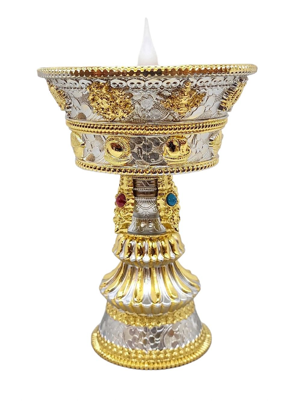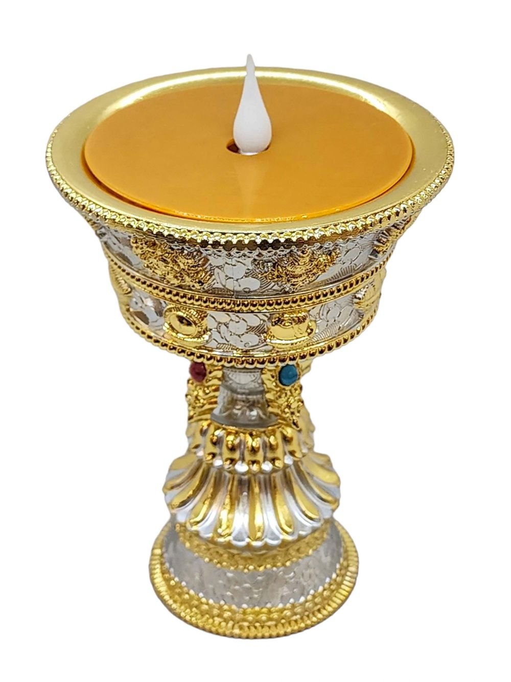 This Butter lamp has been carefully curated to meet local decorative needs in Buddhist homes, and as cherished gifts or decorative accessories for cars and offices. These items, while not handmade, are thoughtfully imported from various countries to ensure quality and aesthetic appeal. They are often crafted from metals and other materials, chosen for their durability and visual charm. Despite their origins, these products serve as meaningful Buddhist ritual items, catering to a growing demand among enthusiasts. We are pleased to include them in our catalog to enhance your spiritual and decorative spaces.