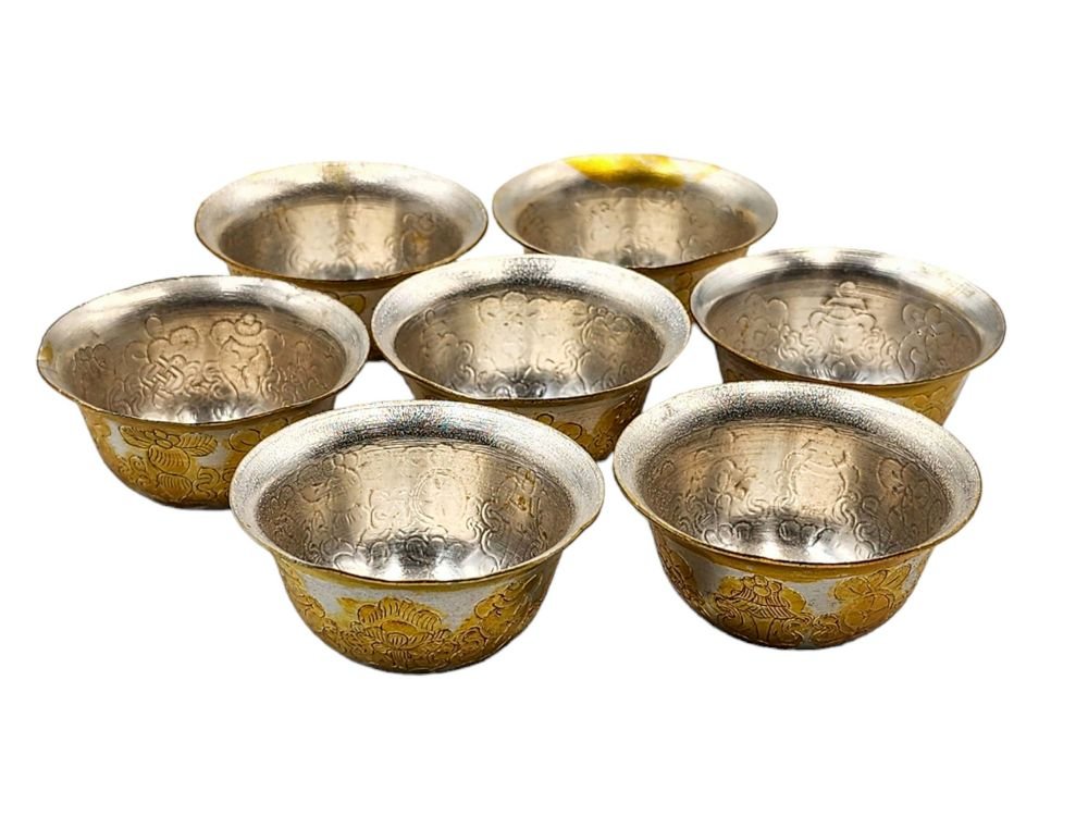 The most common type of offering on Tibetan Buddhist shrines are made with seven water offering bowls — called “yonchap” in Tibetan.