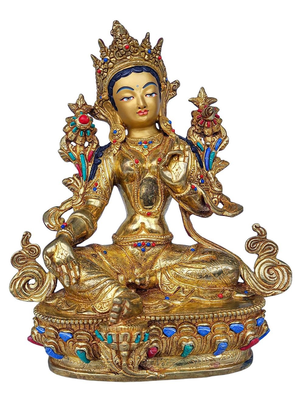 The 21 Tara is adorned with an exquisite array of semi-precious stones, including turquoise, coral, and lapis lazuli. These stones are carefully selected and meticulously placed on the 21 Tara's surface, adding a touch of opulence and enhancing its overall beauty. Each stone is thoughtfully positioned using a high-quality adhesive, ensuring secure and long-lasting attachment. The vibrant colors and unique patterns of the stones create a captivating contrast against the backdrop of the 21 Tara, elevating its visual appeal and making it truly eye-catching. Read More