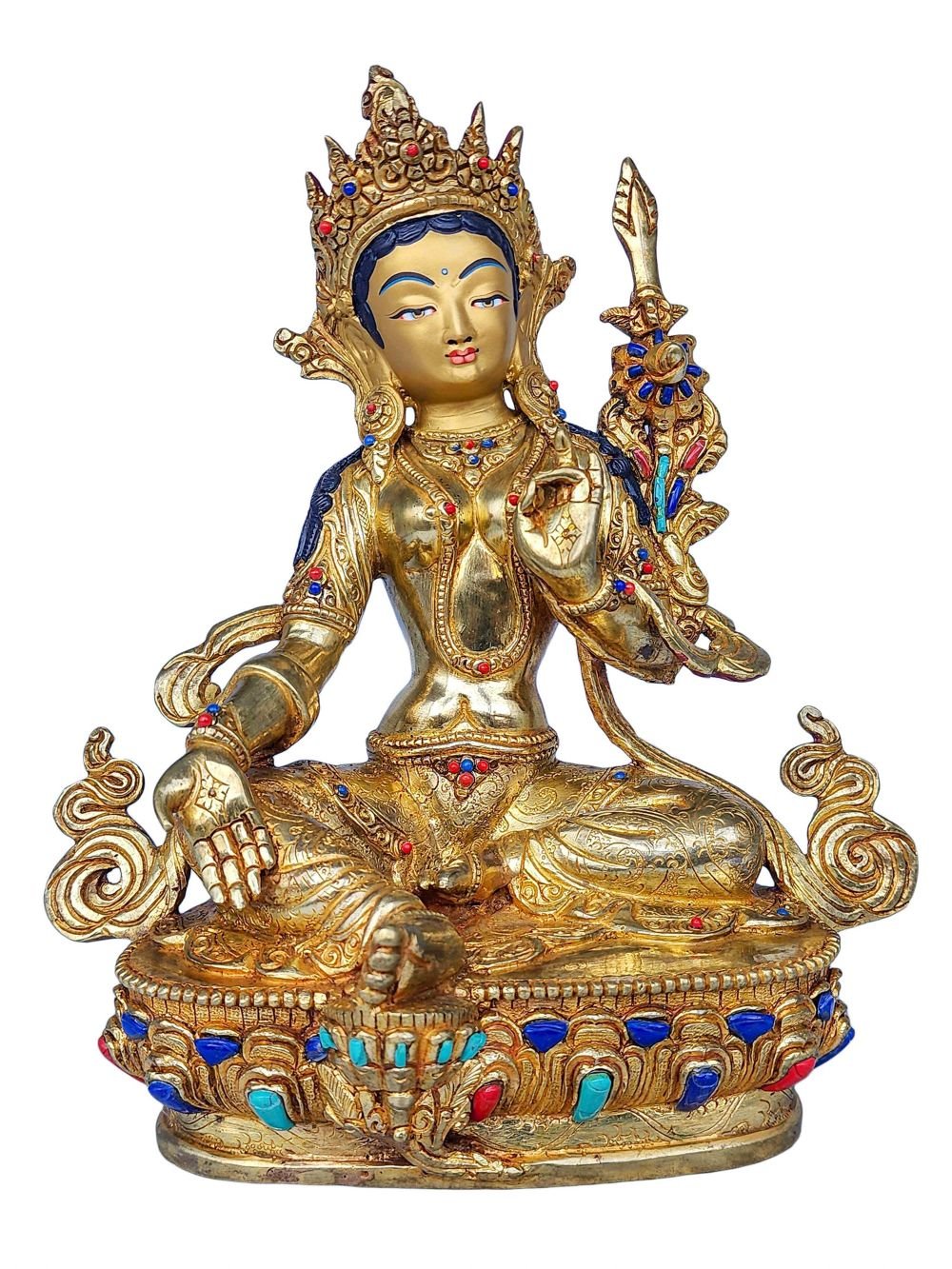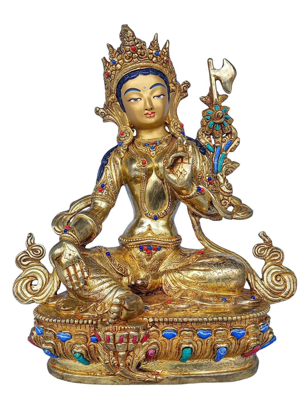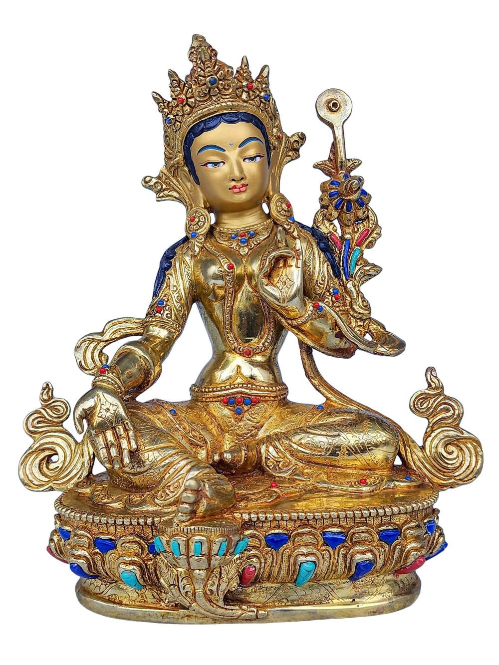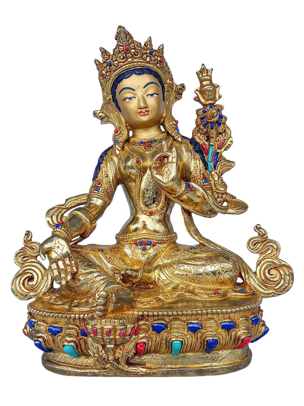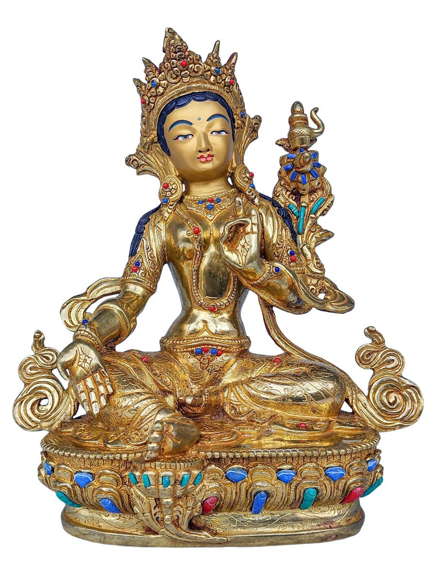 This 21 Tara is finished with full gold plating. also known as mercury gold plating or fire gold plating. This traditional technique involves the application of a genuine layer of gold onto the 21 Tara. Referred to as mercury gold plating, it is considered the correct and authentic form of gold plating in Nepal. Despite being more expensive than electroplating, this traditional mercury gold plating is gaining popularity again in Nepal. People are drawn to its authenticity, longevity, and the unmatched beauty it brings to the 21 Tara. The resurgence of interest in this traditional form of gold plating reflects a growing appreciation for the craftsmanship and cultural heritage of Nepal Read More