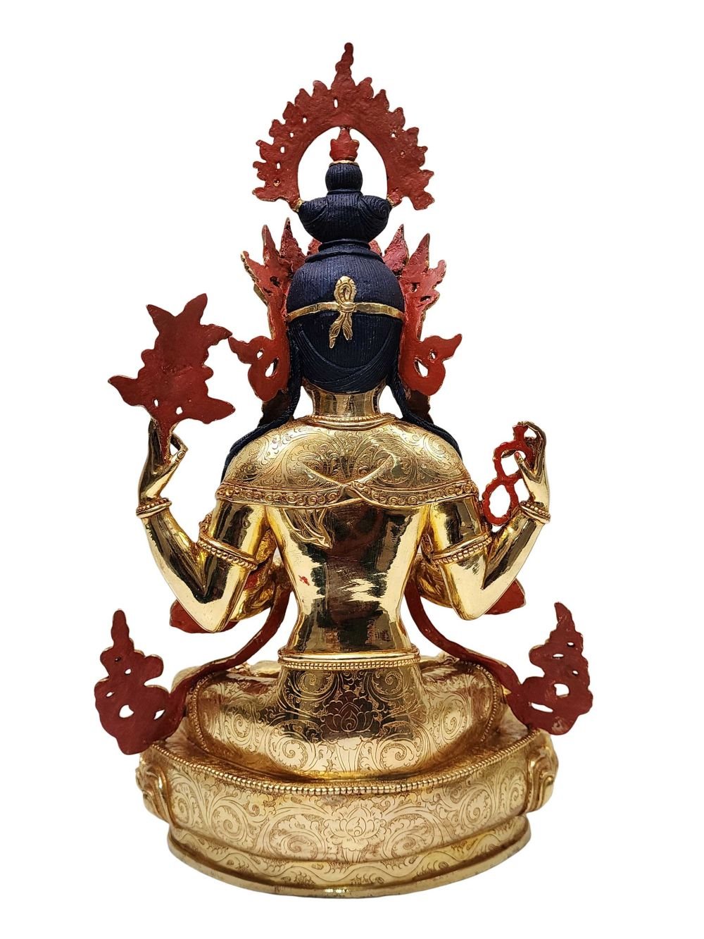 This Chenrezig is finished with full gold plating. also known as mercury gold plating or fire gold plating. This traditional technique involves the application of a genuine layer of gold onto the Chenrezig. Referred to as mercury gold plating, it is considered the correct and authentic form of gold plating in Nepal. Despite being more expensive than electroplating, this traditional mercury gold plating is gaining popularity again in Nepal. People are drawn to its authenticity, longevity, and the unmatched beauty it brings to the Chenrezig. The resurgence of interest in this traditional form of gold plating reflects a growing appreciation for the craftsmanship and cultural heritage of Nepal Read More