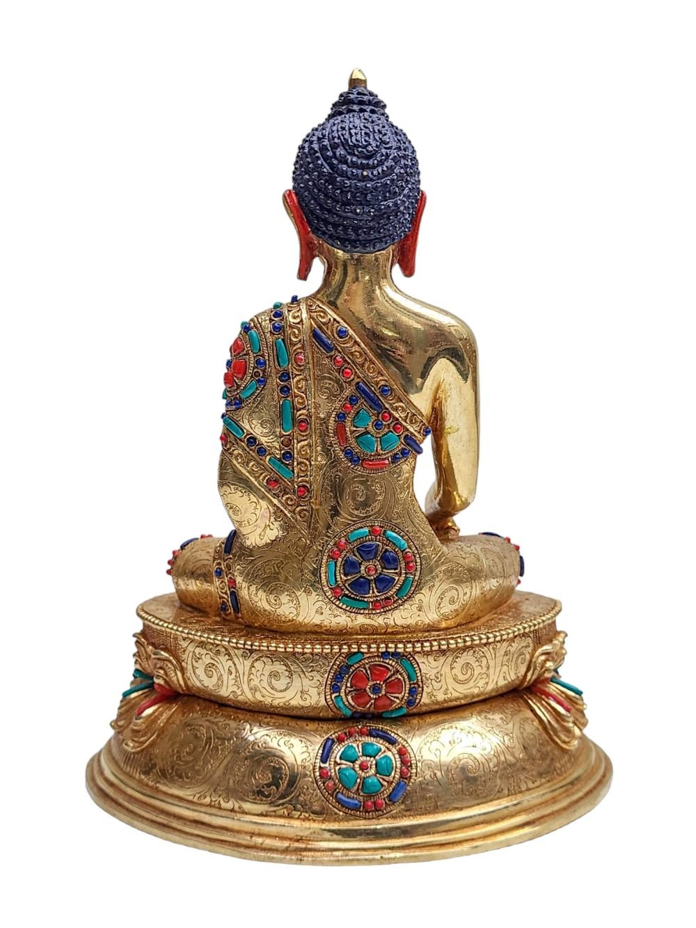 The Shakyamuni Buddha is adorned with an exquisite array of semi-precious stones, including turquoise, coral, and lapis lazuli. These stones are carefully selected and meticulously placed on the Shakyamuni Buddha's surface, adding a touch of opulence and enhancing its overall beauty. Each stone is thoughtfully positioned using a high-quality adhesive, ensuring secure and long-lasting attachment. The vibrant colors and unique patterns of the stones create a captivating contrast against the backdrop of the Shakyamuni Buddha, elevating its visual appeal and making it truly eye-catching. Read More