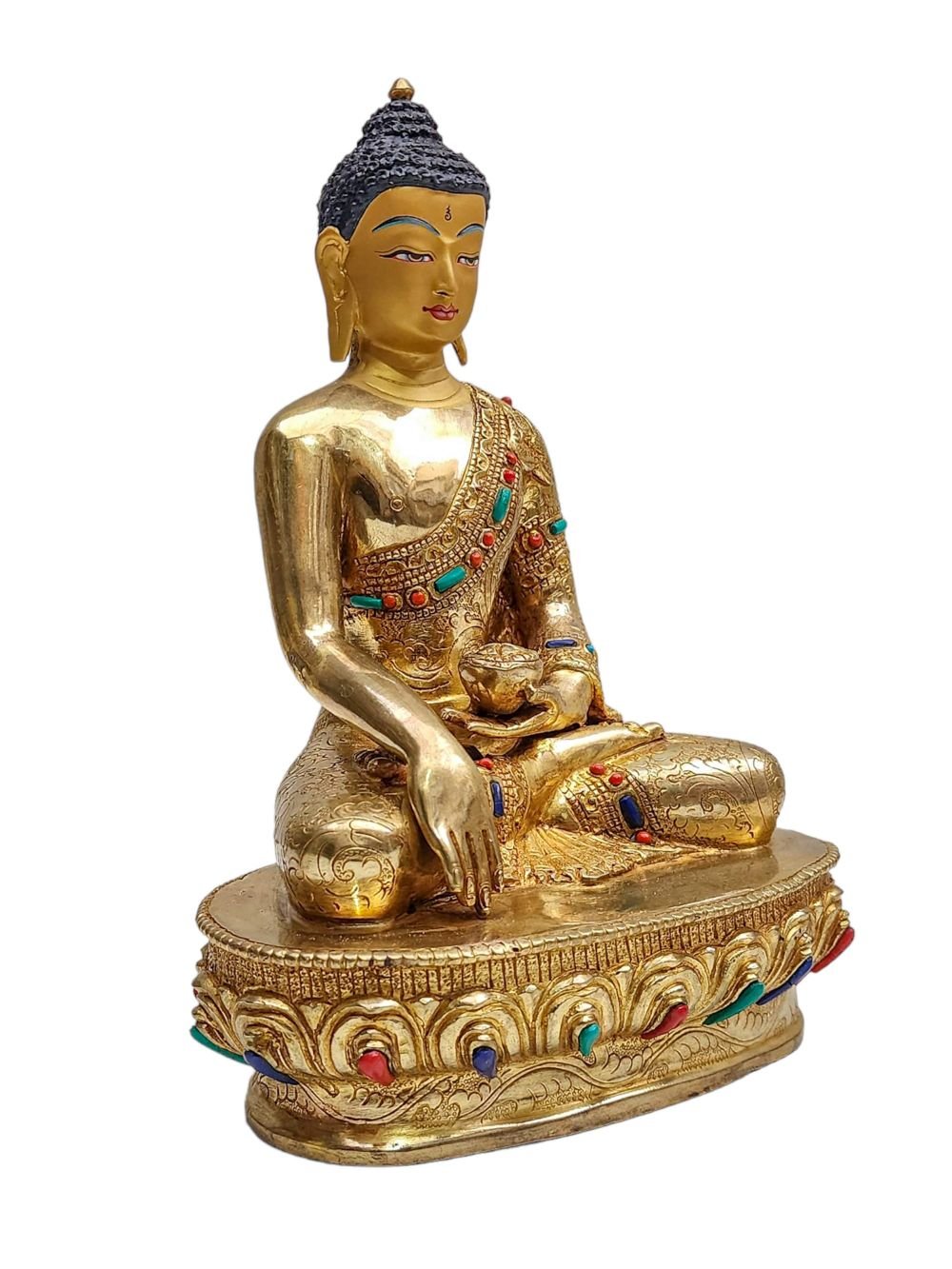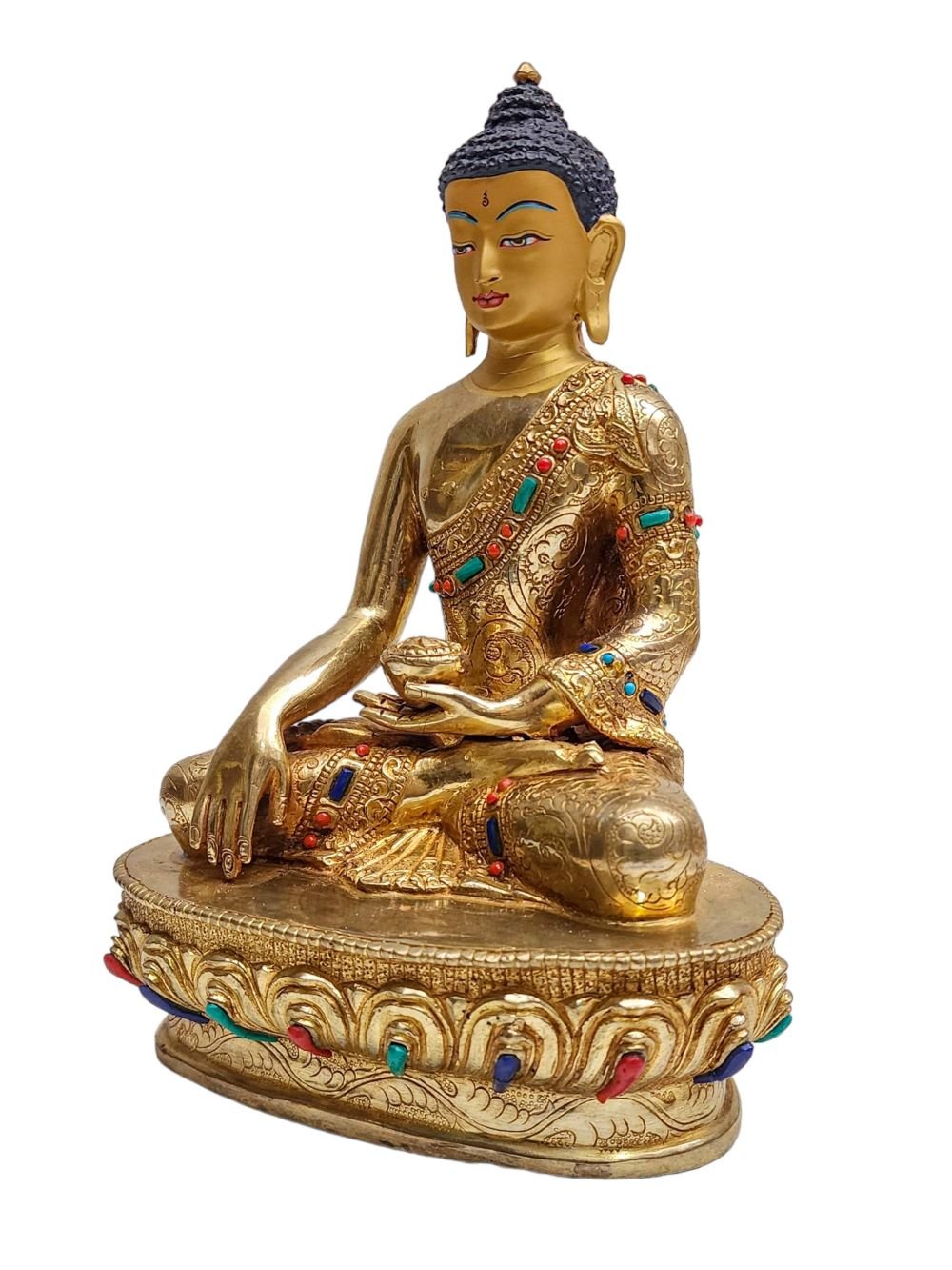 Shakyamuni Buddha, Buddhist Handmade Statue, Face Painted, Stone Setting and Gold Plated , The Enlightened One and Teacher of Humanity