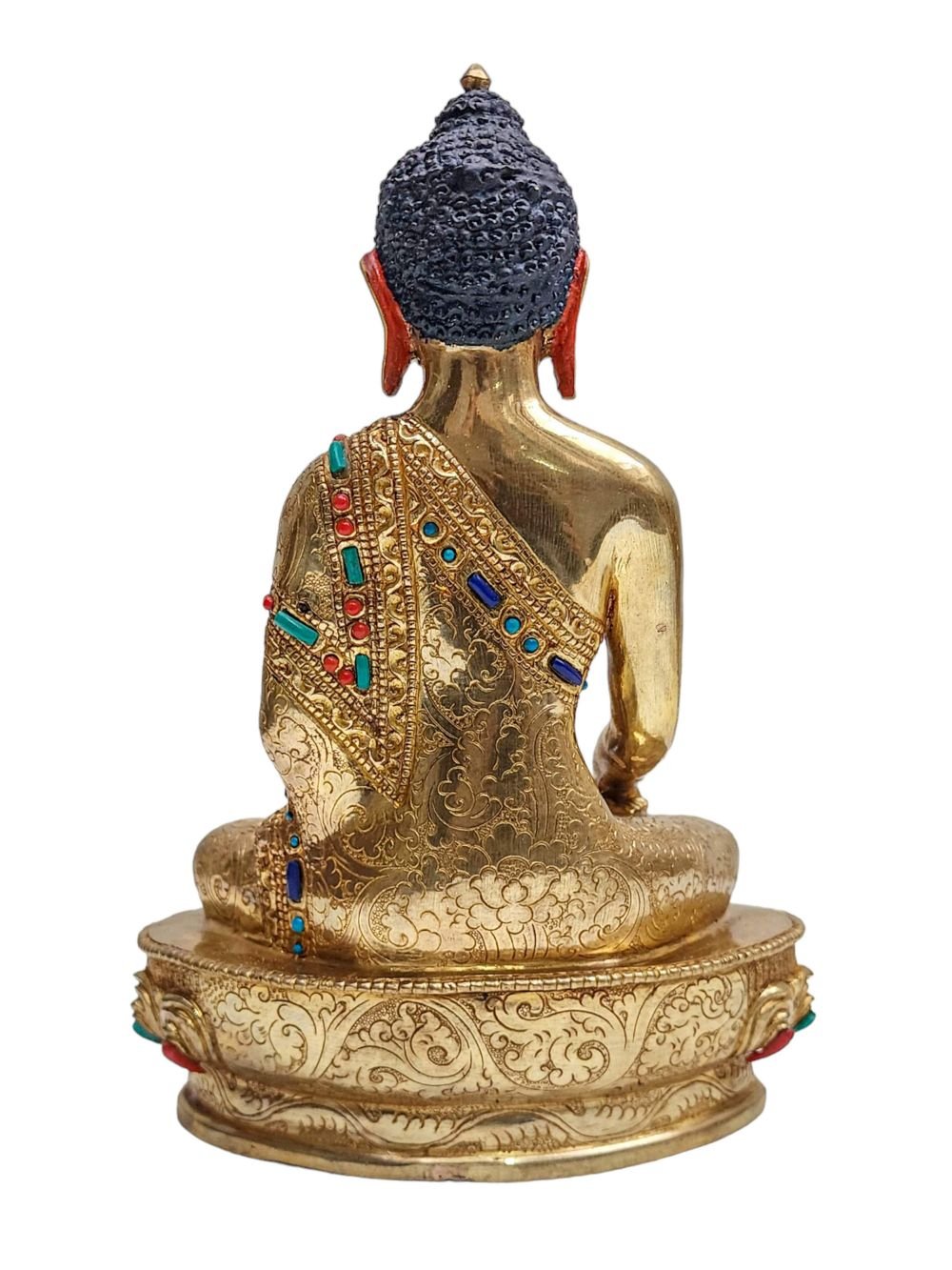 The Shakyamuni Buddha is adorned with an exquisite array of semi-precious stones, including turquoise, coral, and lapis lazuli. These stones are carefully selected and meticulously placed on the Shakyamuni Buddha's surface, adding a touch of opulence and enhancing its overall beauty. Each stone is thoughtfully positioned using a high-quality adhesive, ensuring secure and long-lasting attachment. The vibrant colors and unique patterns of the stones create a captivating contrast against the backdrop of the Shakyamuni Buddha, elevating its visual appeal and making it truly eye-catching. Read More