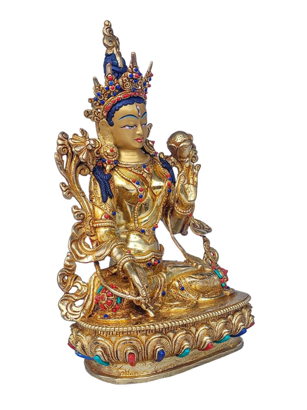 This White Tara is finished with full gold plating. also known as mercury gold plating or fire gold plating. This traditional technique involves the application of a genuine layer of gold onto the White Tara. Referred to as mercury gold plating, it is considered the correct and authentic form of gold plating in Nepal. Despite being more expensive than electroplating, this traditional mercury gold plating is gaining popularity again in Nepal. People are drawn to its authenticity, longevity, and the unmatched beauty it brings to the White Tara. The resurgence of interest in this traditional form of gold plating reflects a growing appreciation for the craftsmanship and cultural heritage of Nepal Read More