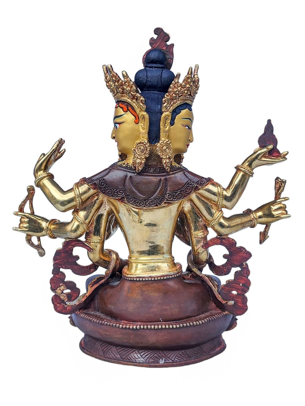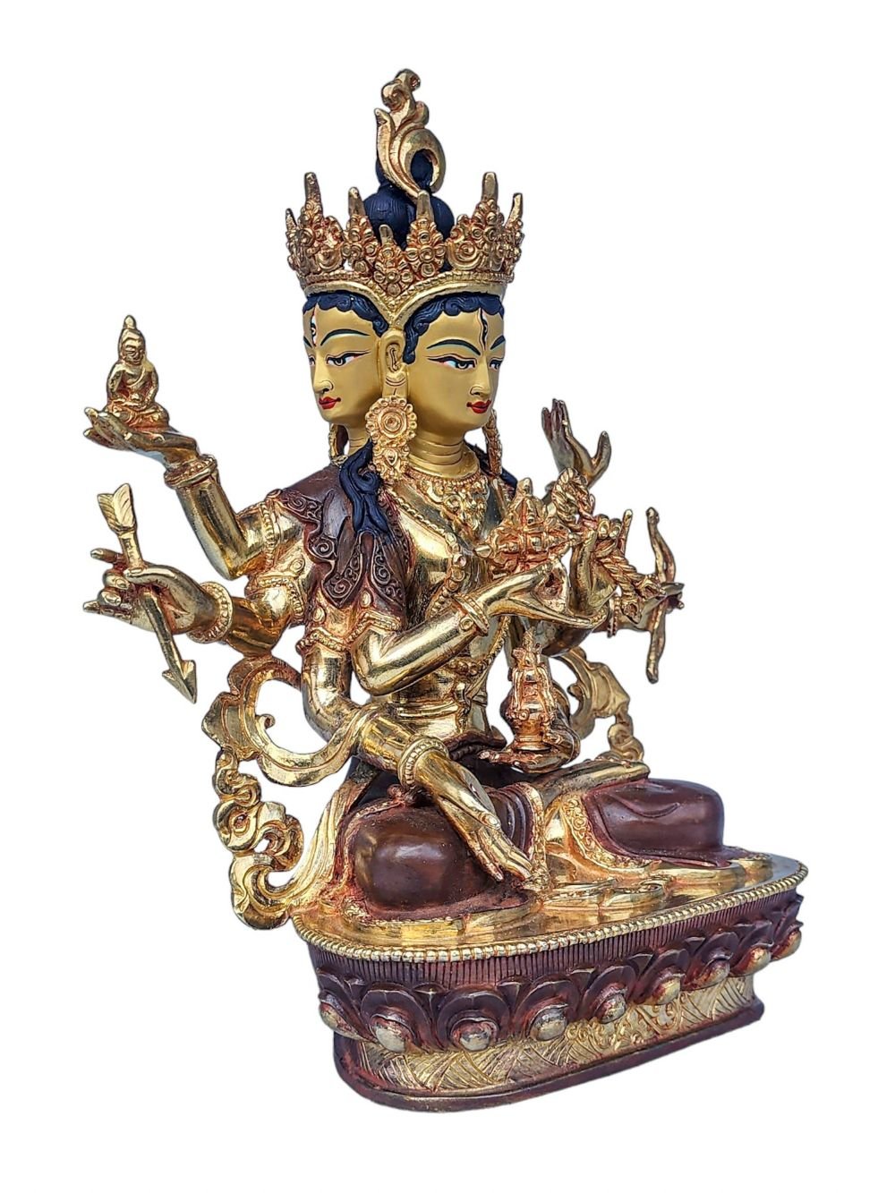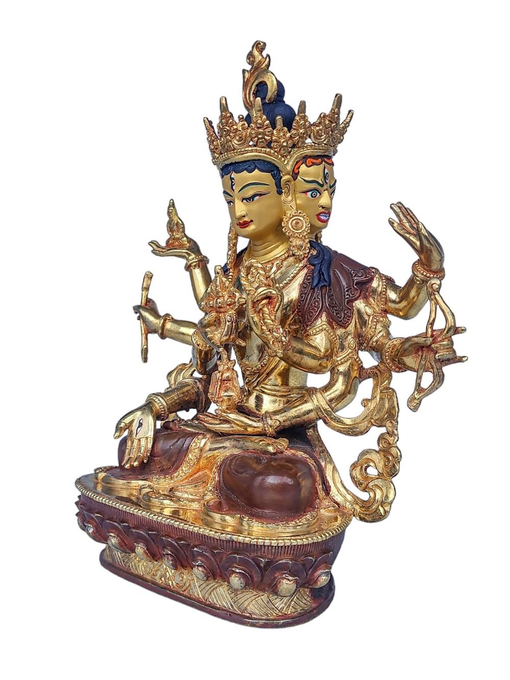 The face of Namgyalma is painted with gold to enhance its significant features, particularly the eyes, and lips. This detailed painting is essential as it brings forth the crucial attributes of the expression of eyes and lips that metal carving alone cannot capture.