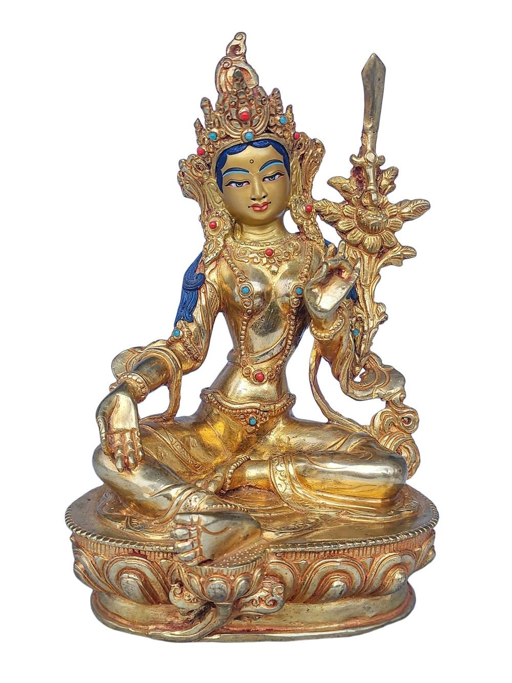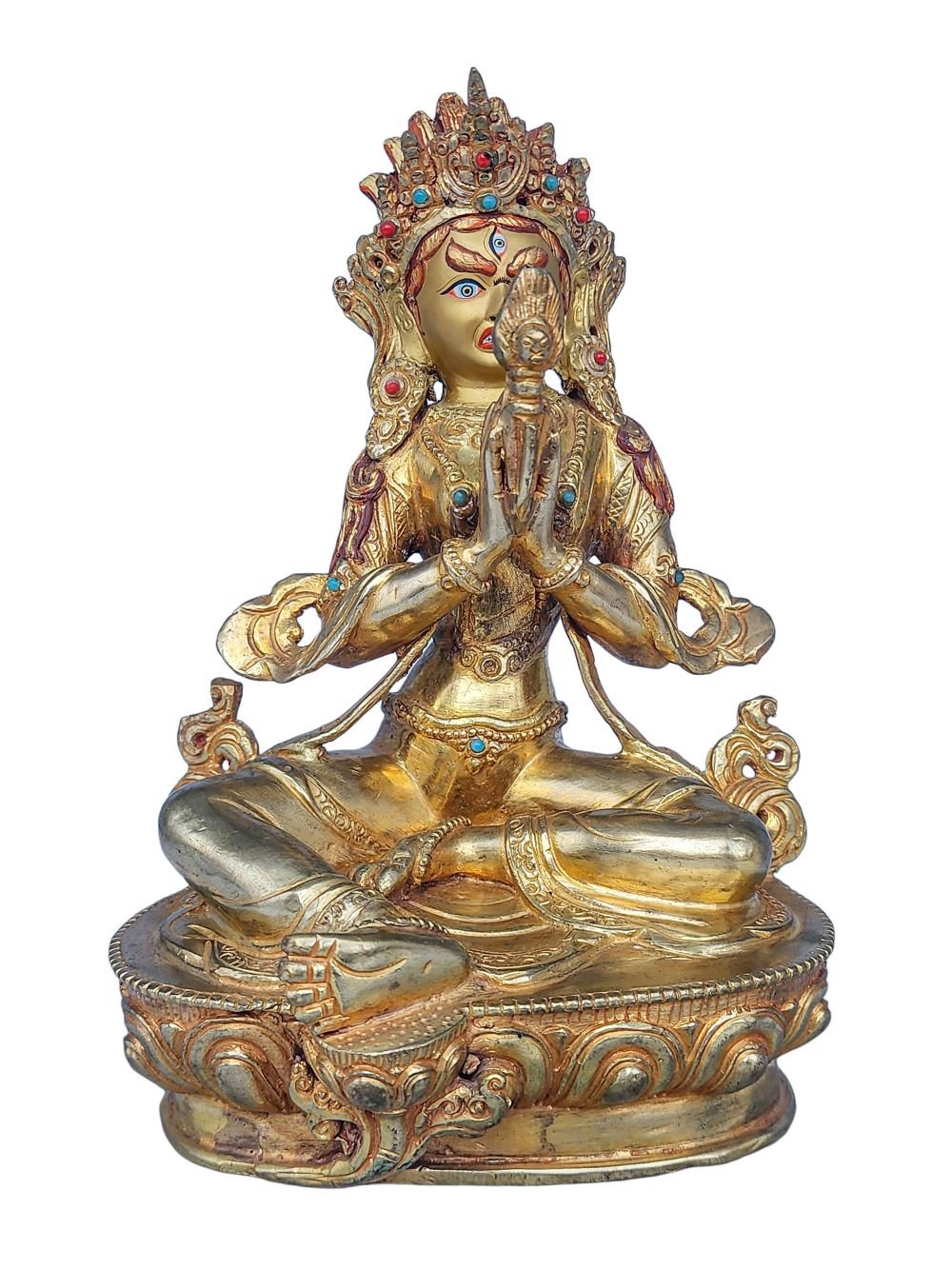 This 21 Tara is finished with full gold plating. also known as mercury gold plating or fire gold plating. This traditional technique involves the application of a genuine layer of gold onto the 21 Tara. Referred to as mercury gold plating, it is considered the correct and authentic form of gold plating in Nepal. Despite being more expensive than electroplating, this traditional mercury gold plating is gaining popularity again in Nepal. People are drawn to its authenticity, longevity, and the unmatched beauty it brings to the 21 Tara. The resurgence of interest in this traditional form of gold plating reflects a growing appreciation for the craftsmanship and cultural heritage of Nepal Read More