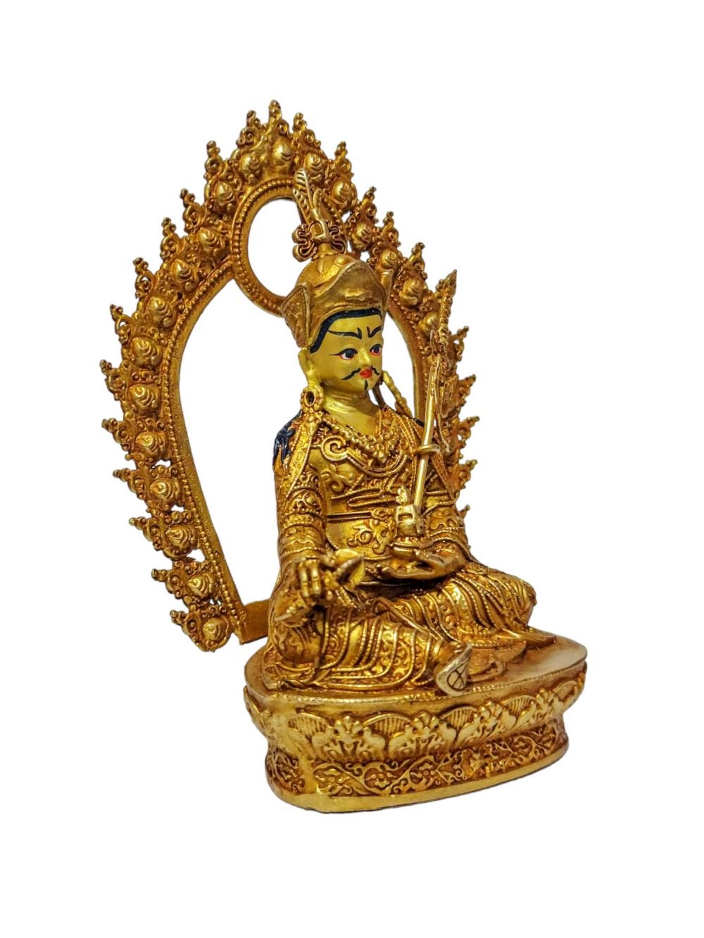 The face of Padmasambhava is painted with gold to enhance its significant features, particularly the eyes, and lips. This detailed painting is essential as it brings forth the crucial attributes of the expression of eyes and lips that metal carving alone cannot capture.