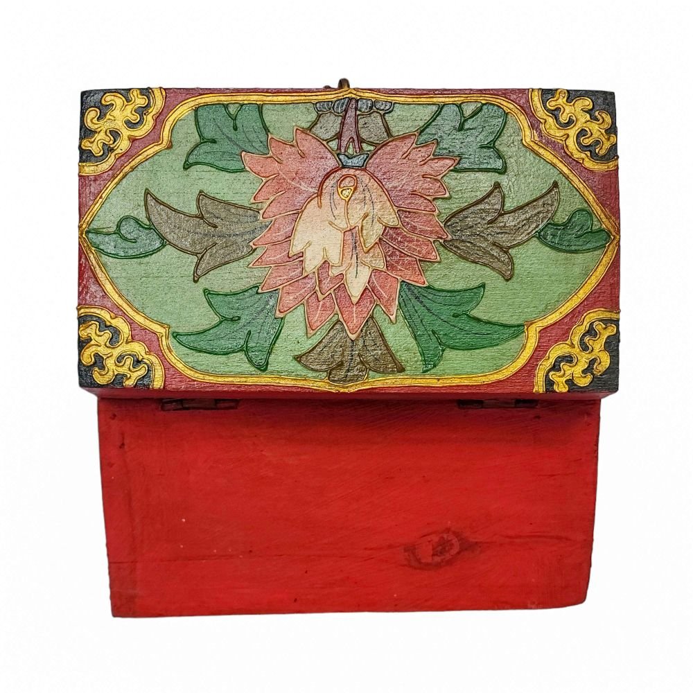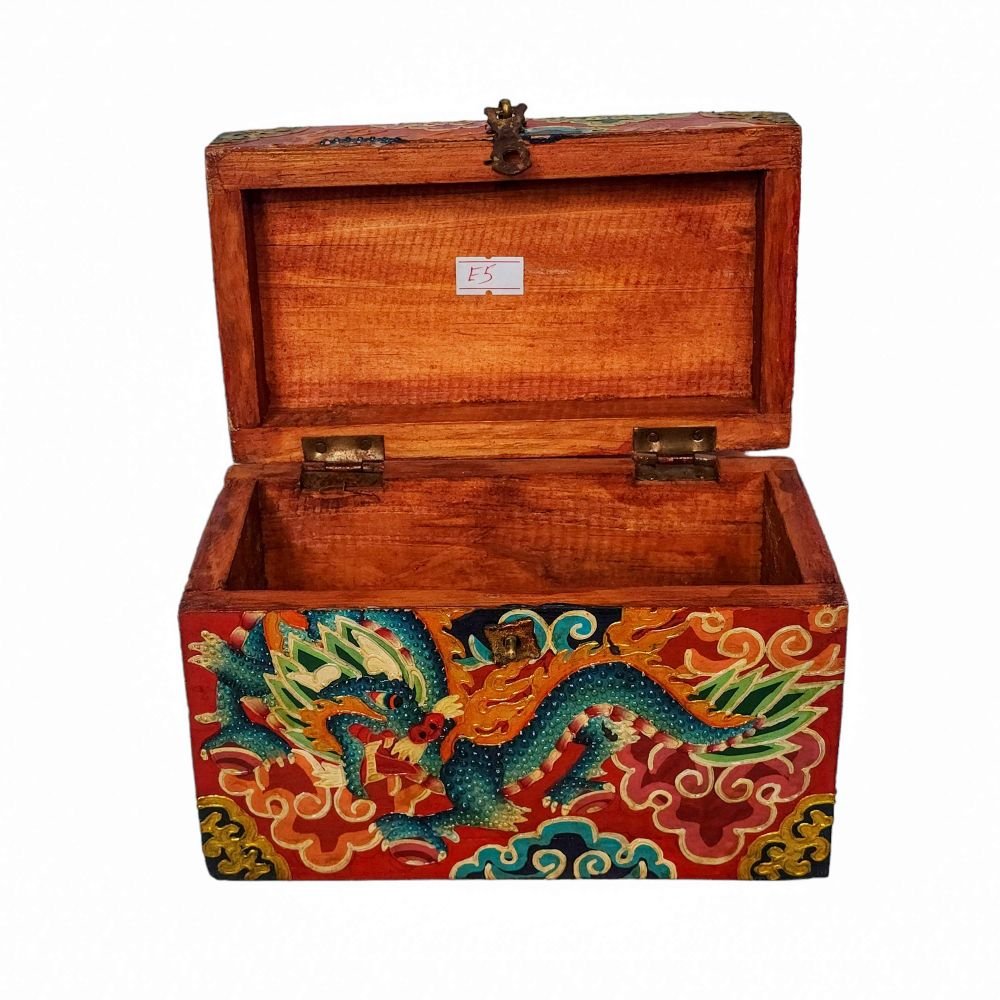A Tibetan wooden box is a handcrafted storage container made from wood and often adorned with intricate Tibetan motifs and vibrant colors. These boxes are typically crafted by skilled artisans using traditional techniques passed down through generations. The decorations on the box usually include symbols of good fortune, such as lotus flowers, endless knots, dragons, or mythical creatures, and are painted in vivid hues like red, blue, green, and gold. These motifs not only add to the aesthetic appeal but also carry significant cultural and spiritual meanings in Tibetan Buddhism. Read More