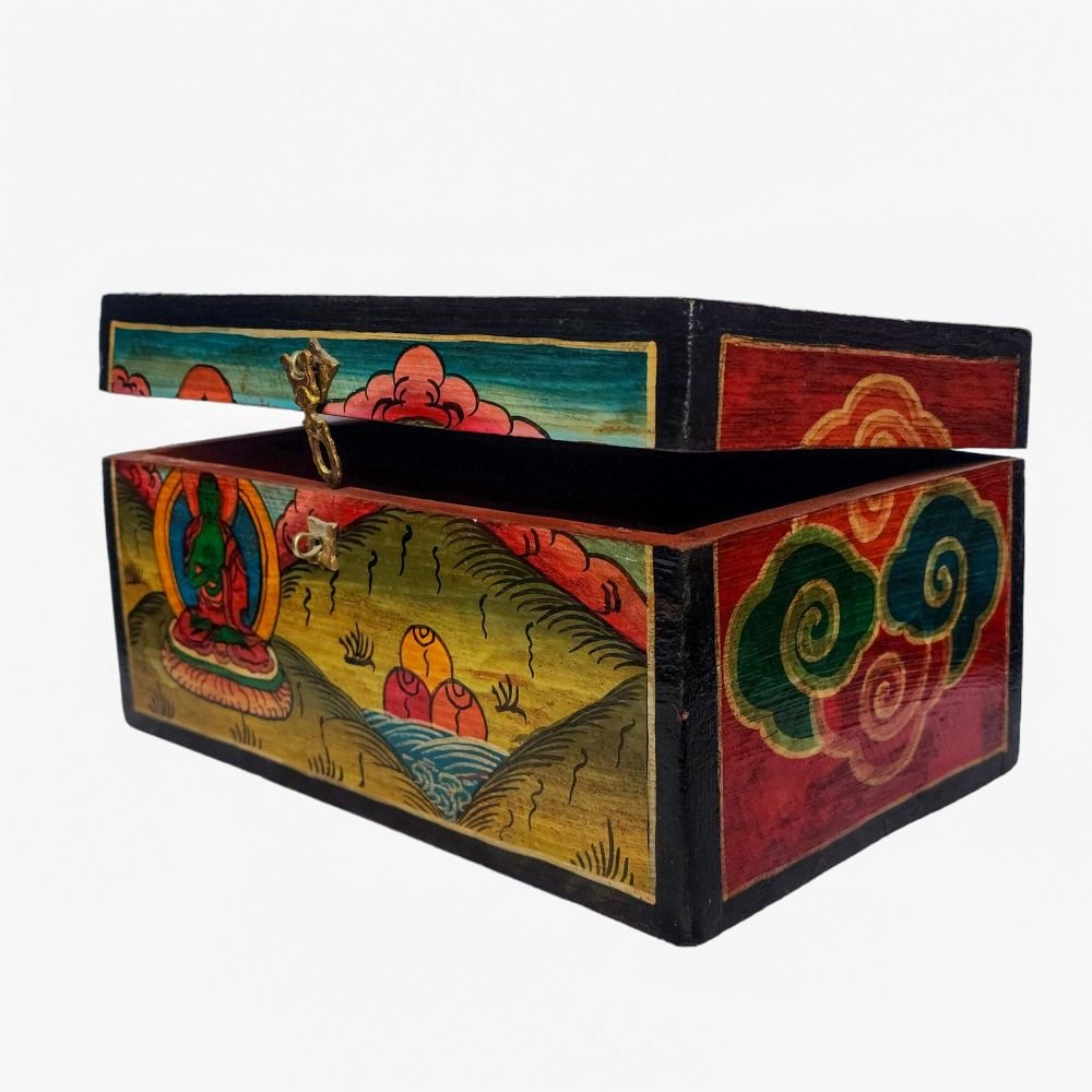 A Tibetan wooden box is a handcrafted storage container made from wood and often adorned with intricate Tibetan motifs and vibrant colors. These boxes are typically crafted by skilled artisans using traditional techniques passed down through generations. The decorations on the box usually include symbols of good fortune, such as lotus flowers, endless knots, dragons, or mythical creatures, and are painted in vivid hues like red, blue, green, and gold. These motifs not only add to the aesthetic appeal but also carry significant cultural and spiritual meanings in Tibetan Buddhism. Read More