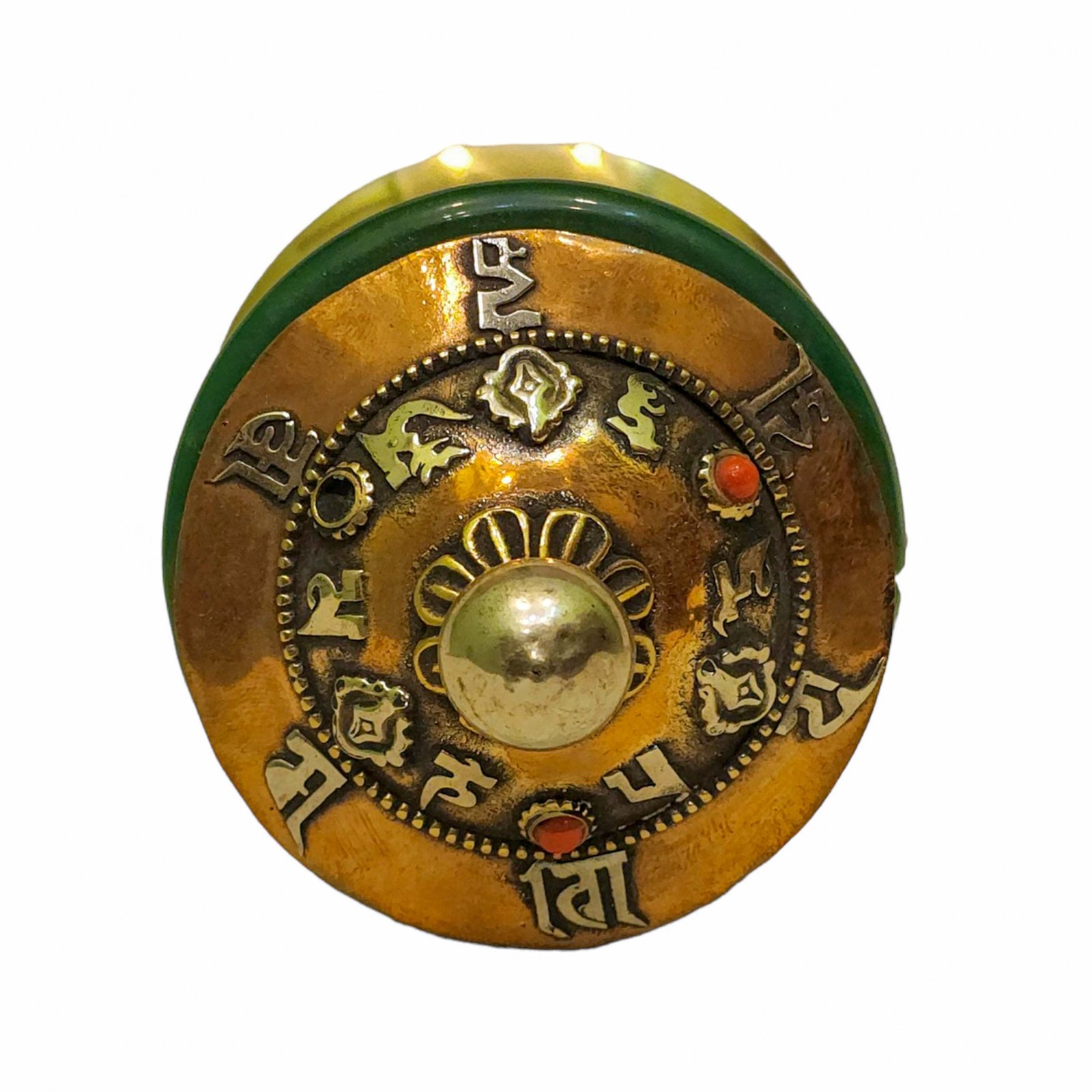 A prayer wheel is a cylindrical wheel on a spindle made from metal, wood, stone, leather, or coarse cotton. Traditionally, the mantra Om Mani Padme Hum is written in the Newari language of Nepal, on the outside of the wheel. Also sometimes depicted are Dakinis, Protectors, and very often the 8 auspicious symbols Ashtamangala. At the core of the cylinder is a "Life Tree" often made of wood or metal with certain mantras written on or wrapped around it. Many thousands (or in the case of larger prayer wheels, millions) of mantras are then wrapped around this life tree. The Mantra Om Mani Padme Hum is most commonly used, but other mantras may be used as well. According to the Tibetan Buddhist tradition based on the lineage texts regarding prayer wheels, spinning such a wheel will have much the same meritorious effect as orally reciting the prayers. Read More