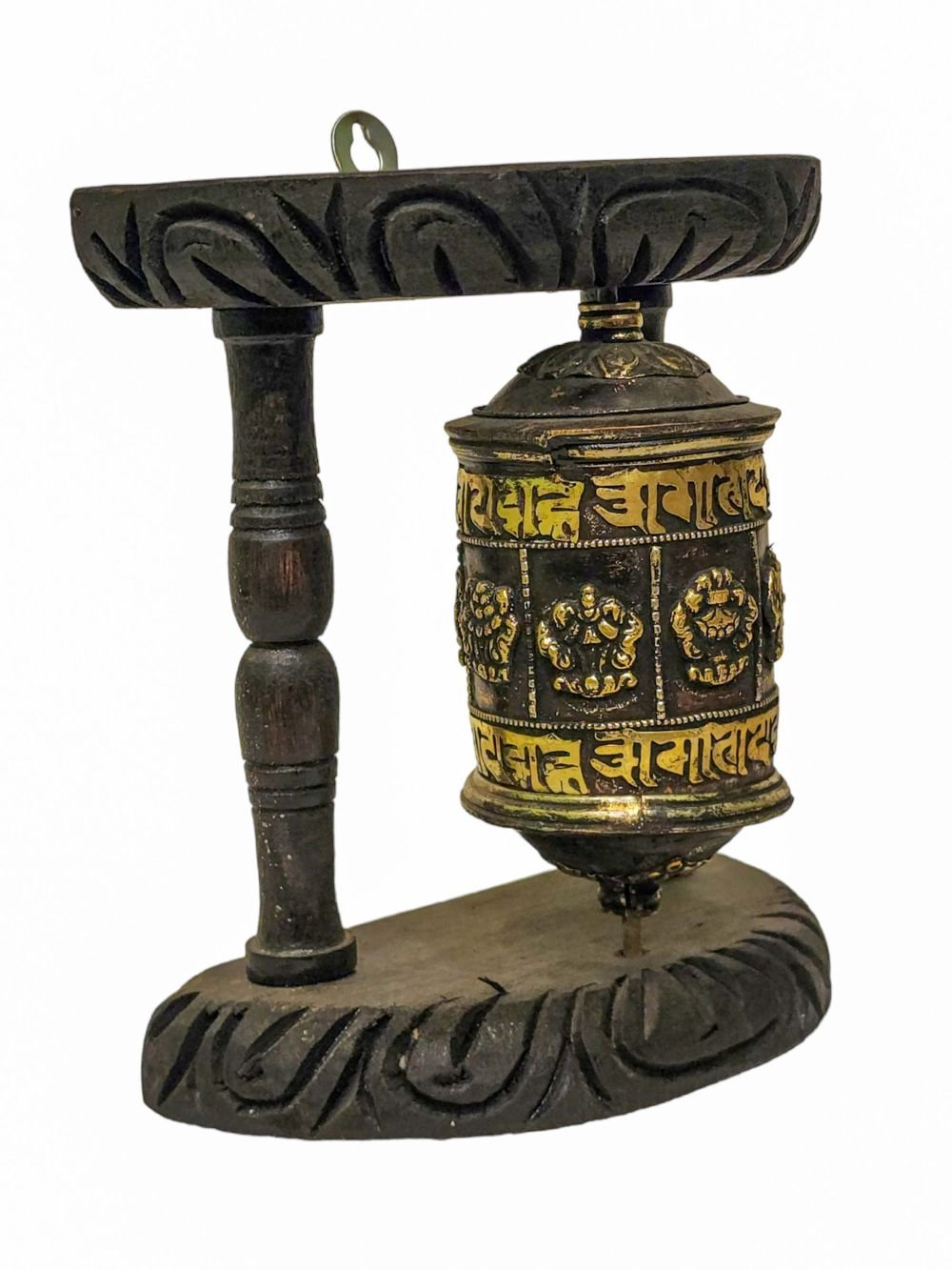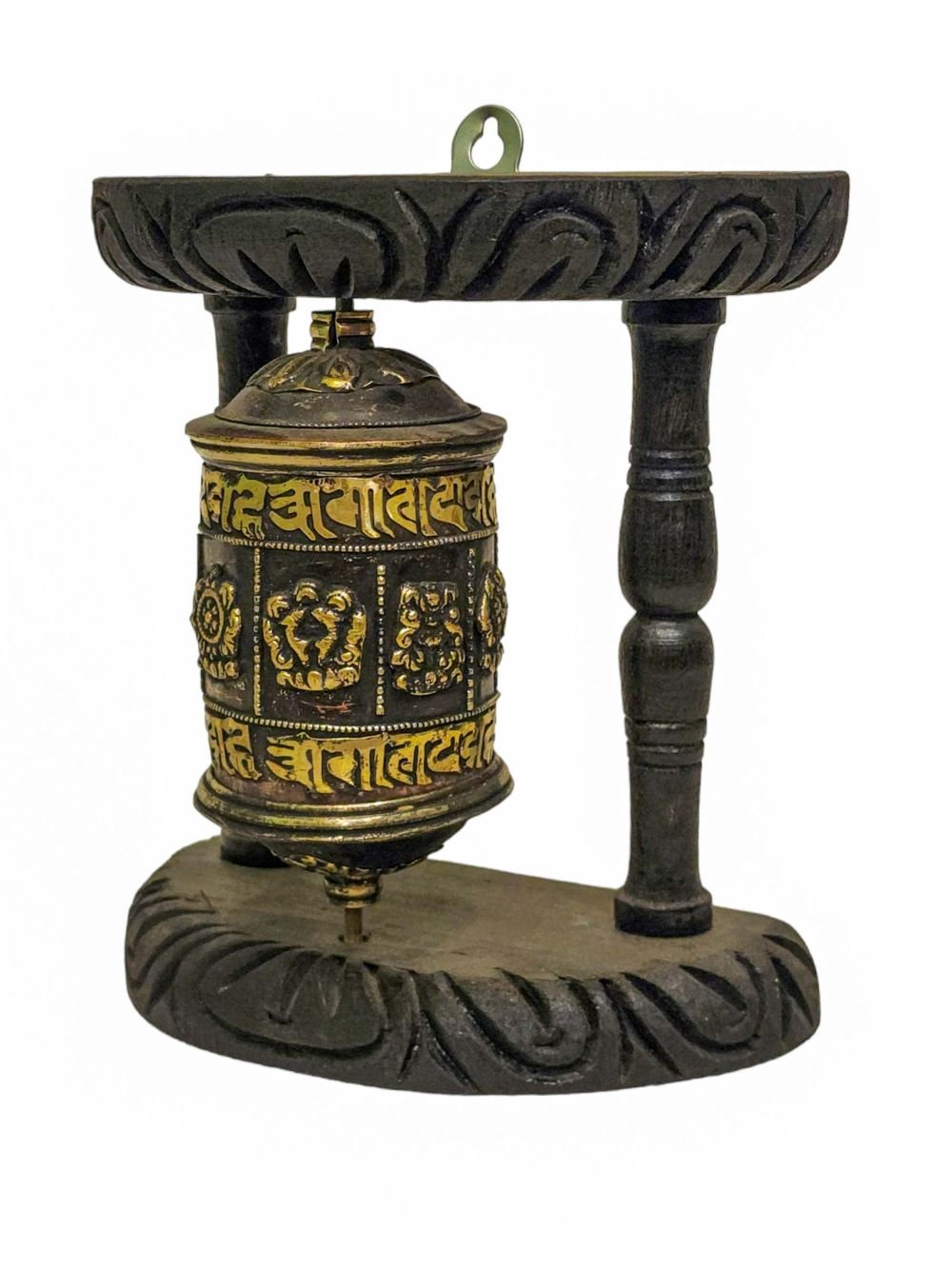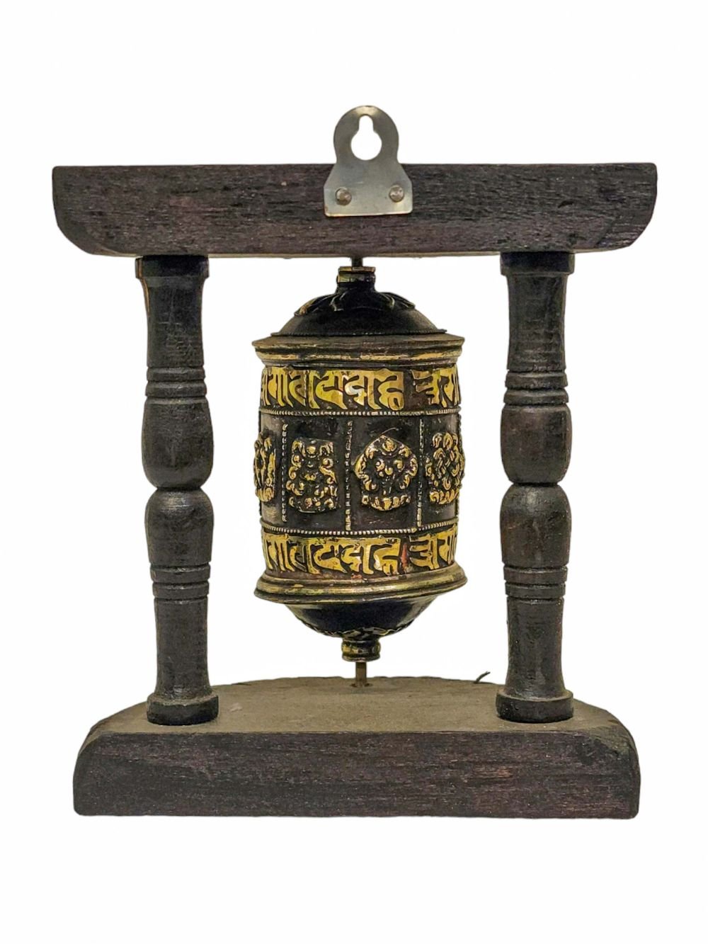 Prayer Wheel with Mantra Inside, Oxidized with Carved Mantra, Ashtamangala, Wall Mountable , A wheel containing mantras, used to accumulate merit and spread blessings