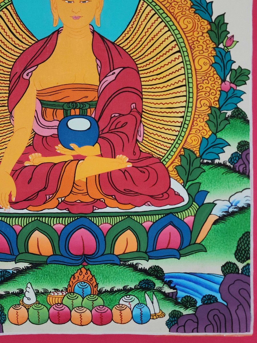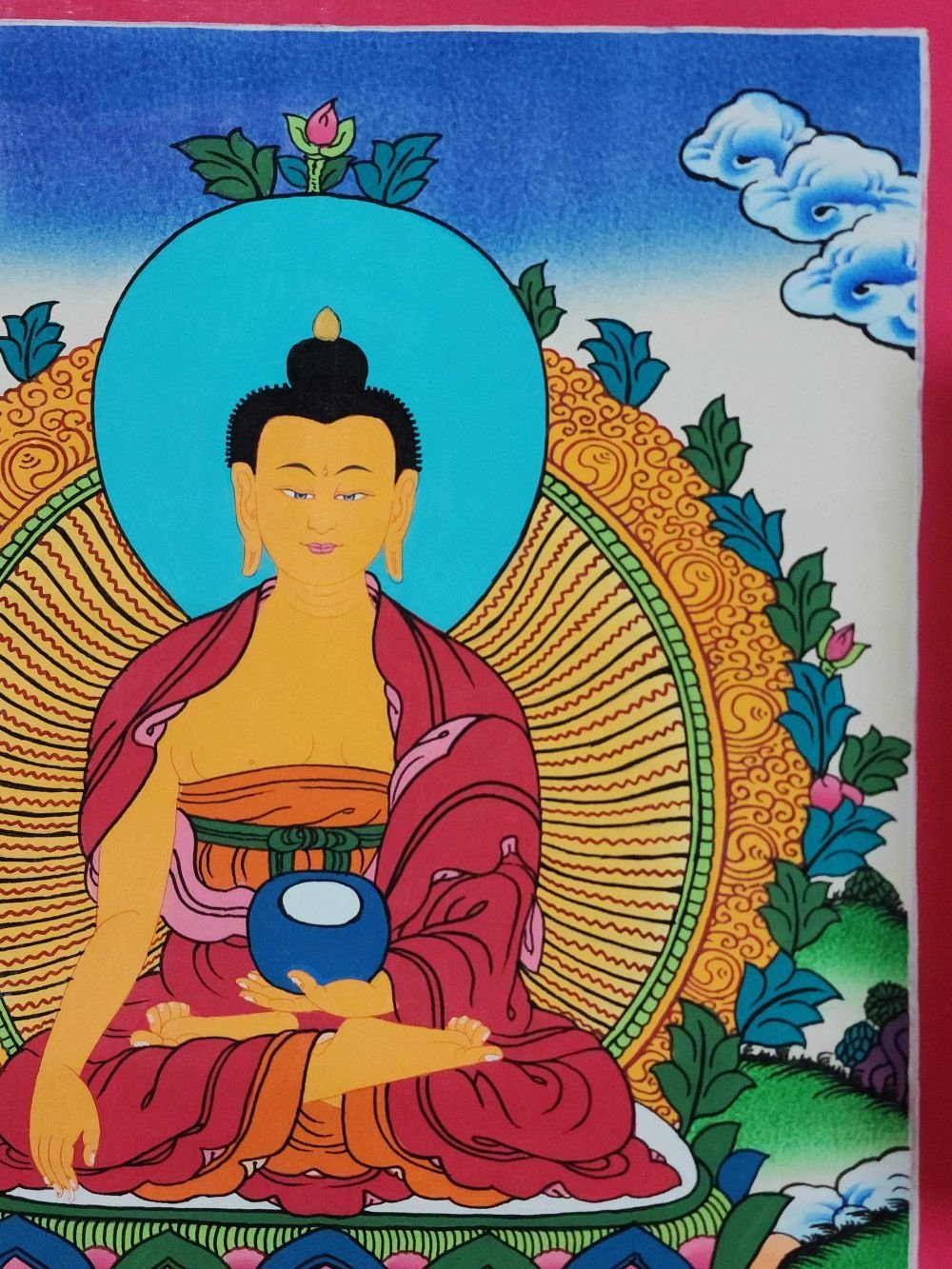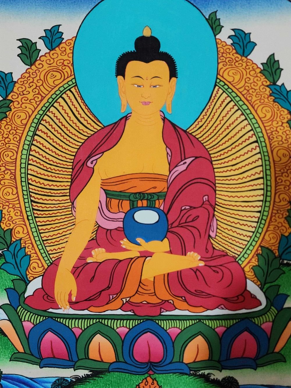 Gautama is painted with golden skin sitting in a lotus seat [Skt. Padmasana] also called the meditative seat [Skt. Dhyanasana] & upon a white moon disc which represents the male principle of method which itself is upon a lotus throne. His left hand touches the ground in what is called bhumisparse mudra which symbolises his own recognition of enlightened mind in one of the most iconic images in all Buddhism. The palm always faces inwards. His feet are deliberately drawn level with one another & enlarged, being specific marks of a Buddha. His right hand supports an alms bowl [Skt. Patra], containing the liquid elixir of eternal life. Somehow the simple image of the bowl reflects his overwhelming humility & kindness. He wears the traditionally maroon gold monk's patched robe [Skt. Samghati] made of twenty five pieces of cloth which the first Buddhist monks sewed together. The Buddha has a green nimbus and blue aureole around his body signifying the highest level of understanding. Siddhartha is surrounded by Pink Lotuses [Skt. Padma]. This kind of lotus is connected with loving kindness & a flowering of pure consciousness. The closed bud to his right side represents the past or originating mind, the blooming flower represents the present & the buds represents the future Buddha Maitreya and forthcoming realisations. His elongated earlobes depict his royal connection; his knotted black hair & topknot symbolise his abandonment of worldly possessions; the dot [Skt. Urna] on his brow on the command chakra [Skt. Ajna] represents his transcendent wisdom, the 31st mark of a Buddha.