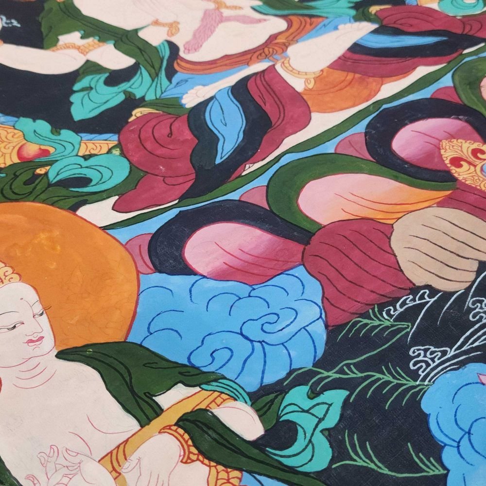 A thangka, also known as tangka, thanka, or tanka, is a vibrant and intricate Tibetan Buddhist painting that serves as a visual representation of spiritual teachings. Crafted with meticulous detail on cotton or silk appliqué, thangkas depict a wide range of subjects including Buddhist deities, sacred scenes, mandalas, and narrative stories. These sacred artworks are traditionally kept unframed and rolled up for storage, resembling ancient scrolls. To protect their delicate nature, thangkas are mounted on textile backings and often adorned with a silk cover on the front. Proper preservation in dry environments is crucial to maintain the integrity and longevity of the silk. Read More