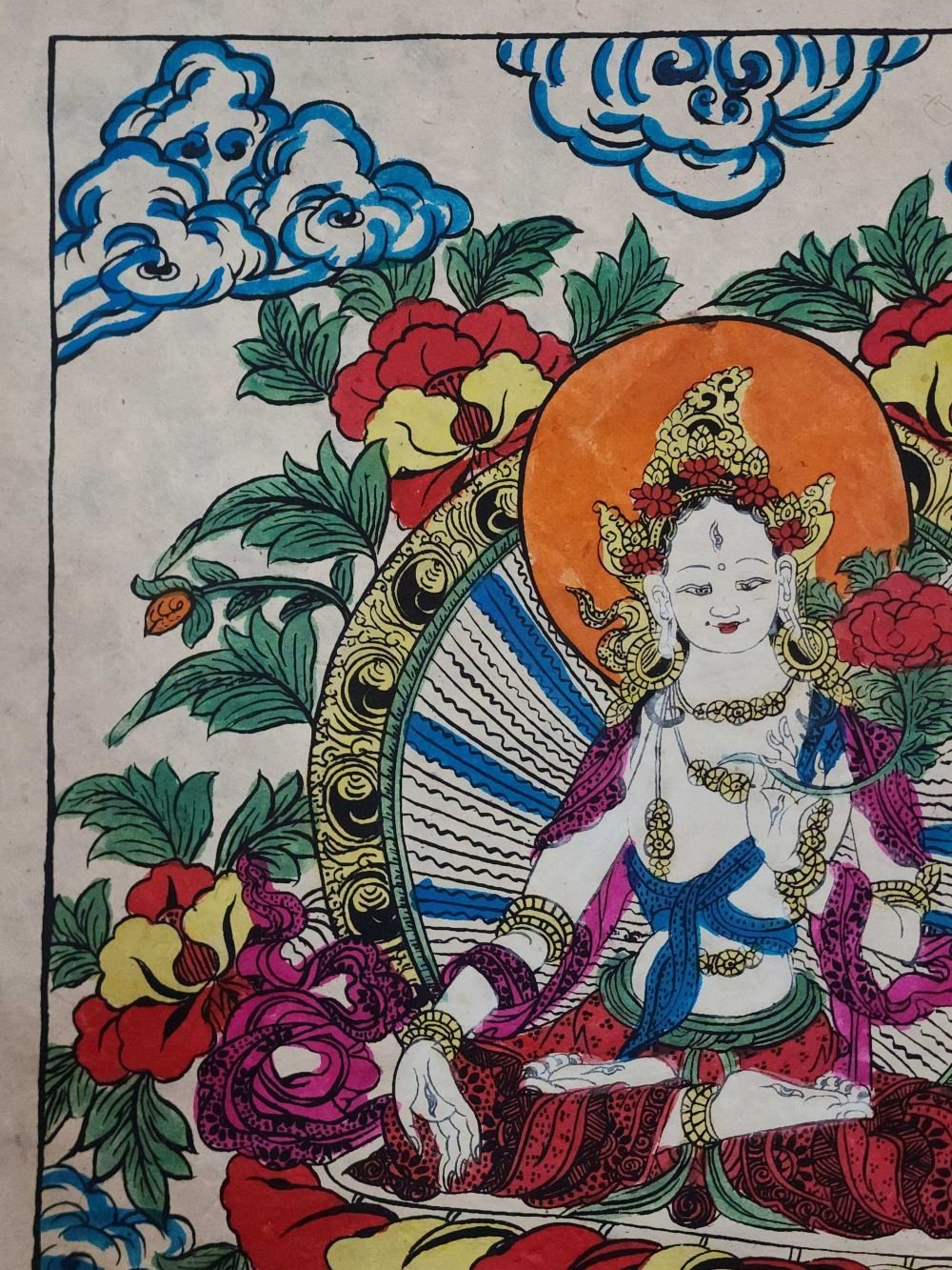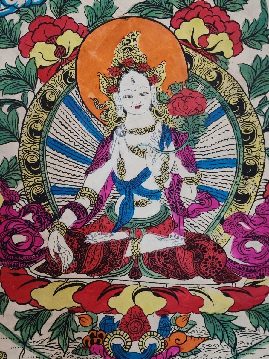 White Tara Paper Thangka, Buddhist Traditional Painting, Hand Painted , Goddess of longevity, healing, and serene compassion