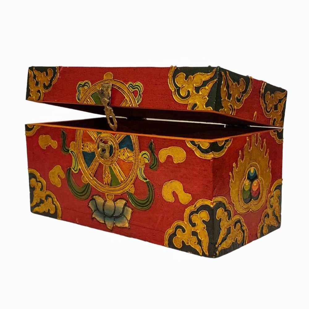A Tibetan wooden box is a handcrafted storage container made from wood and often adorned with intricate Tibetan motifs and vibrant colors. These boxes are typically crafted by skilled artisans using traditional techniques passed down through generations. The decorations on the box usually include symbols of good fortune, such as lotus flowers, endless knots, dragons, or mythical creatures, and are painted in vivid hues like red, blue, green, and gold. These motifs not only add to the aesthetic appeal but also carry significant cultural and spiritual meanings in Tibetan Buddhism. Read More