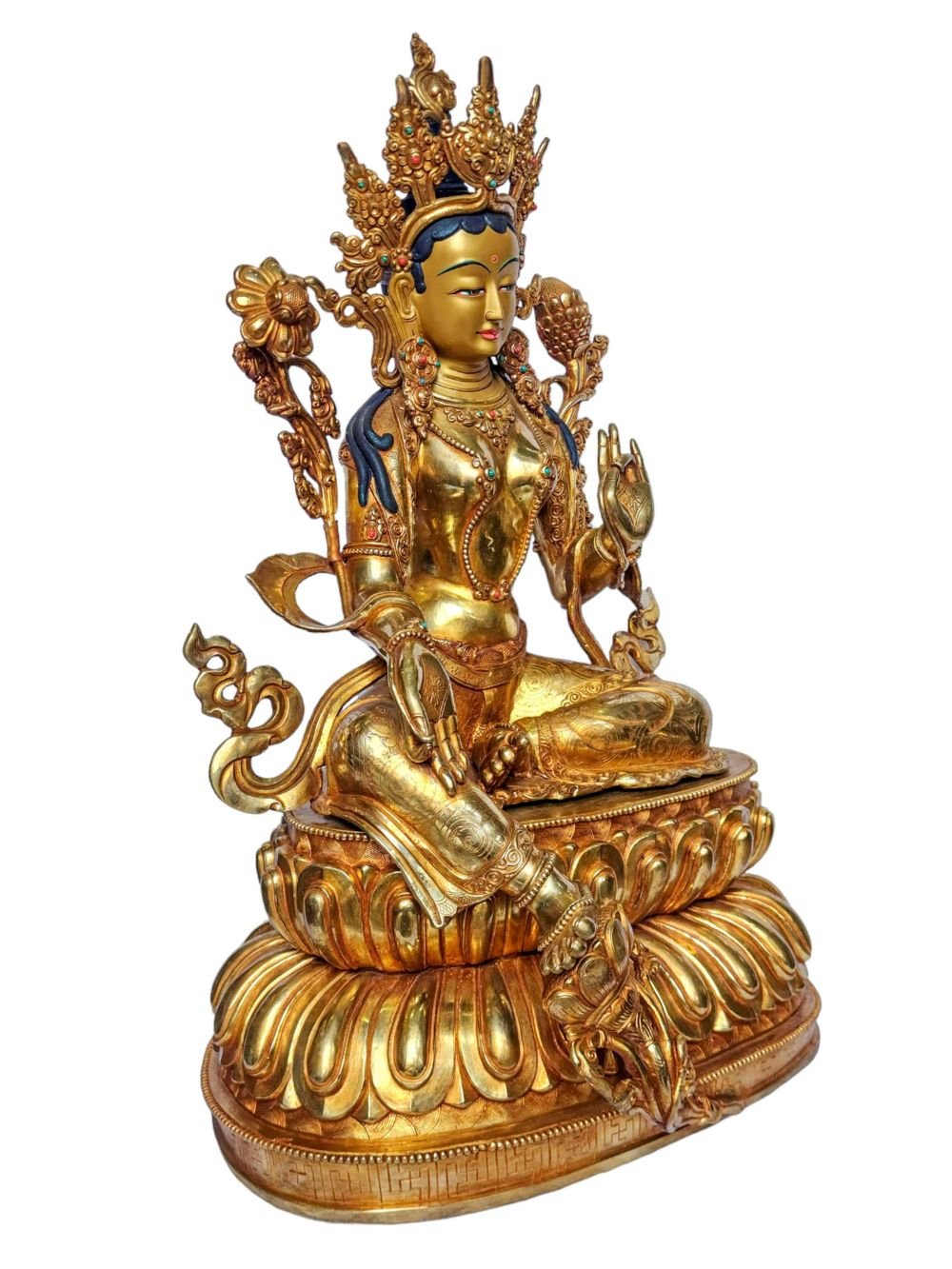 This Green Tara is finished with full gold plating. also known as mercury gold plating or fire gold plating. This traditional technique involves the application of a genuine layer of gold onto the Green Tara. Referred to as mercury gold plating, it is considered the correct and authentic form of gold plating in Nepal. Despite being more expensive than electroplating, this traditional mercury gold plating is gaining popularity again in Nepal. People are drawn to its authenticity, longevity, and the unmatched beauty it brings to the Green Tara. The resurgence of interest in this traditional form of gold plating reflects a growing appreciation for the craftsmanship and cultural heritage of Nepal Read More