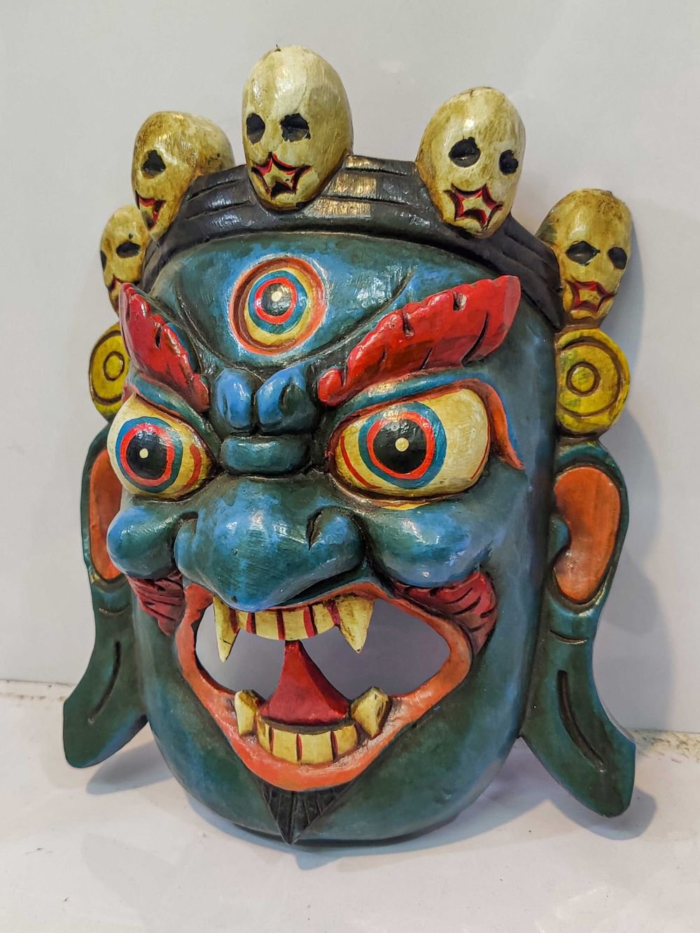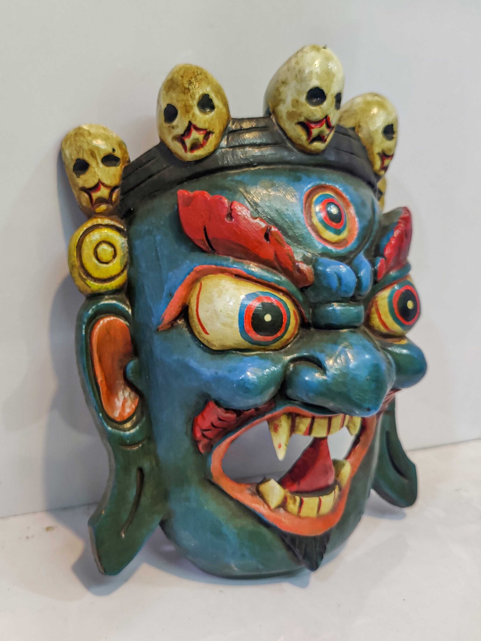 Bhairav, Handmade Wooden Mask, Wall Hanging, Painted Blue, Poplar Wood, Mahakala Two Arms , Fierce protector, destroys obstacles, guards the Dharma
